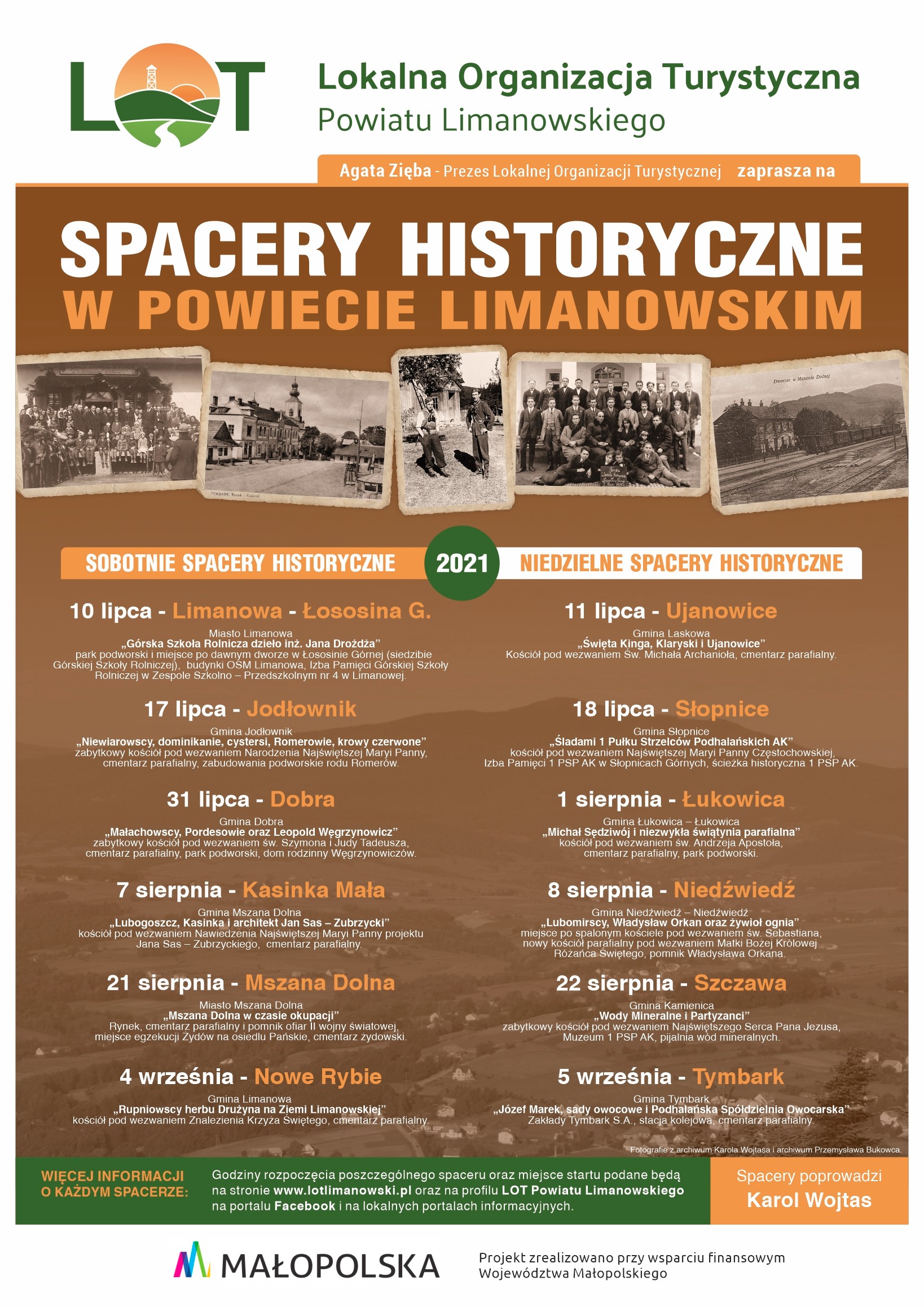 Spacery Historyczne w Powiecie Limanowskim organizowane są przez Lokalną Organizację Turystyczną Powiatu Limanowskiego w ramach projektu „Spotkania z historią w Powiecie Limanowskim. Projekt realizowany jest przy wsparciu finansowym Województwa Małopolskiego.