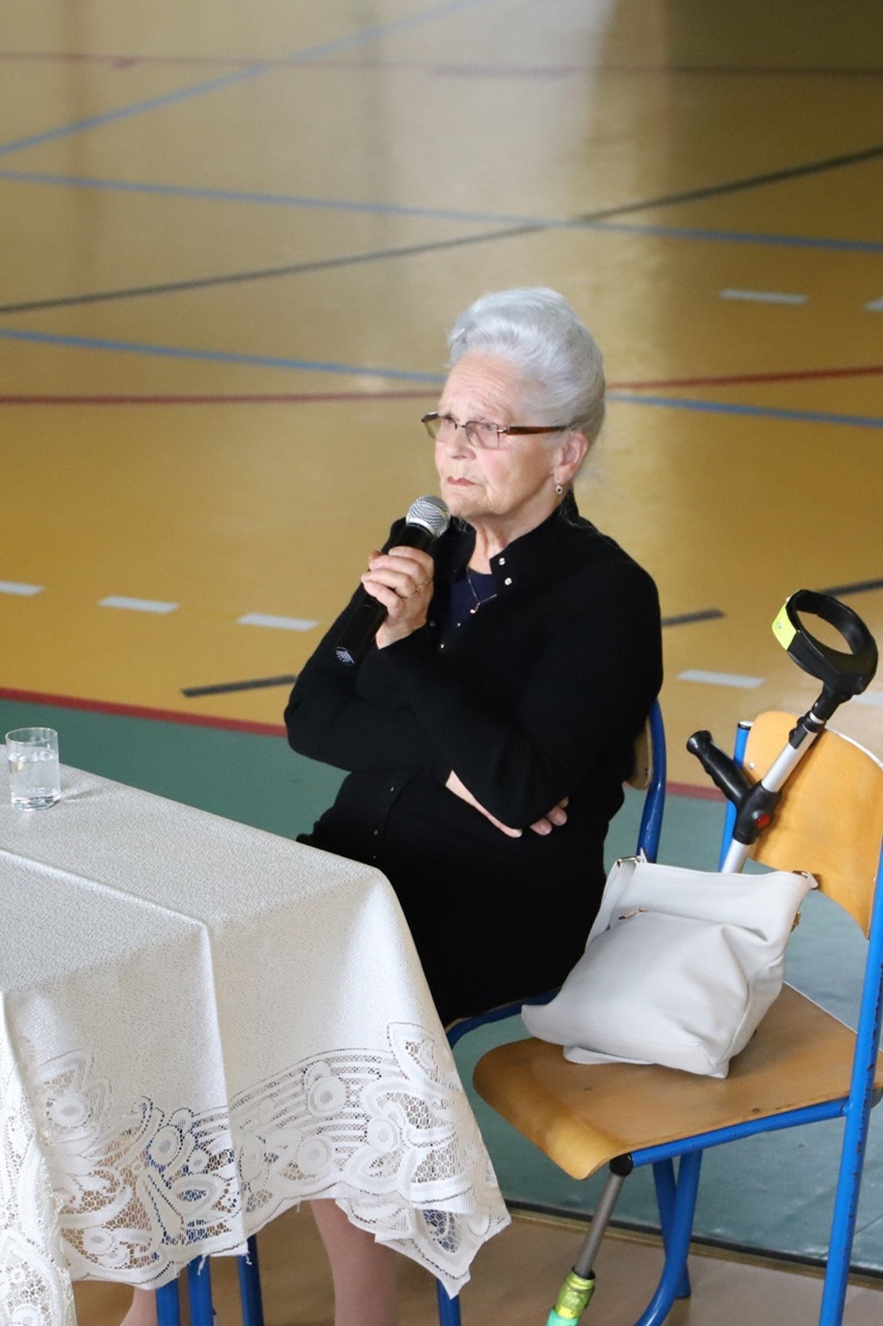 Uczniowie zwrócili uwagę, że na „naszych ziemiach” także zostawiły ślad działania II wojny światowej. Są to pomniki ofiar, cmentarze czy pojedyncze mogiły rozsiane po całej Ziemi Limanowskiej. Są to także ludzie, którzy dzięki Bogu przeżyli i pamiętają okrutne lata okupacji, życia i tułaczki Polaków. Zatem kolejnym elementem naszych obchodów rocznicowych było spotkanie z NIEZWYKŁYM GOŚCIEM – „SYBIRACZKĄ”- Panią Aleksandrą Potoczek. Mama Pani Aleksandry pochodziła z Kłodnego z rodziny Lachorów, a obecnie Pani Aleksandra mieszka w Marcinkowicach. Spotkanie wywarło na uczniach ogromne wrażenie. Ciekawy, barwny sposób przekazu spowodował, że uczniowie słuchali z zainteresowaniem opowieści o losach rodziny Pani Aleksandry i innych Polaków, którzy zostali deportowani po wrześniu 1939 roku w głąb Rosji w tym na Syberię. Powrót niektórych z nich był możliwy dopiero po zakończeniu wojny, po 1945 roku. Wiemy jednak, że wielu z nich nie wróciło, a potomkowie „Sybiraków” wracali i jeszcze wracają do dziś. Powrót rodziny Potoczków był możliwy dzięki temu, że ojciec został odznaczony Orderem Virtuti Militari za bohaterstwo w walce w szeregach I Dywizji Piechotyim. Tadeusza Kościuszki. Teraz Pani Aleksandra jest aktywną działaczką Związku Sybiraków i mimo swojego wieku chętnie uczestnicy w spotkaniach z młodzieżą, bo uważa, że najważniejszą rzeczą dla nas jest Polska i miłość do Ojczyzny, i tego chce uczyć młode pokolenie.
