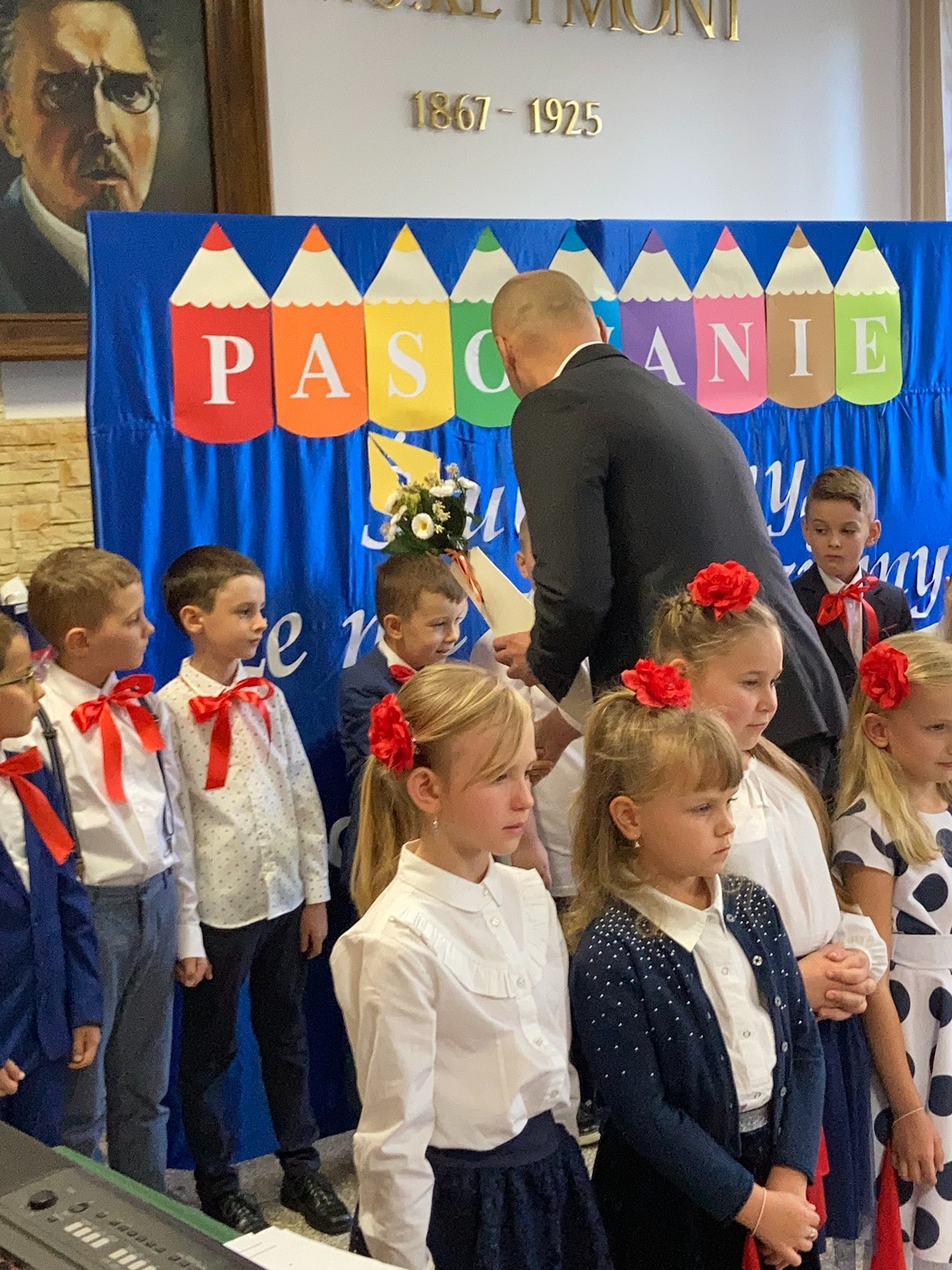 Po części artystycznej, w niezwykle podniosłej atmosferze, pierwszoklasiści ślubowali być dobrymi Polakami, godnie reprezentować swoją szkołę, swym zachowaniem i nauką sprawiać radość rodzicom i nauczycielom. Po złożonym ślubowaniu Dyrektor Zbigniew Król dokonał symbolicznego pasowania na ucznia. Uczniowie uroczyście złożyli odcisk palca na Akcie Ślubowania i otrzymali swój pierwszy dokument – legitymację szkolną.
