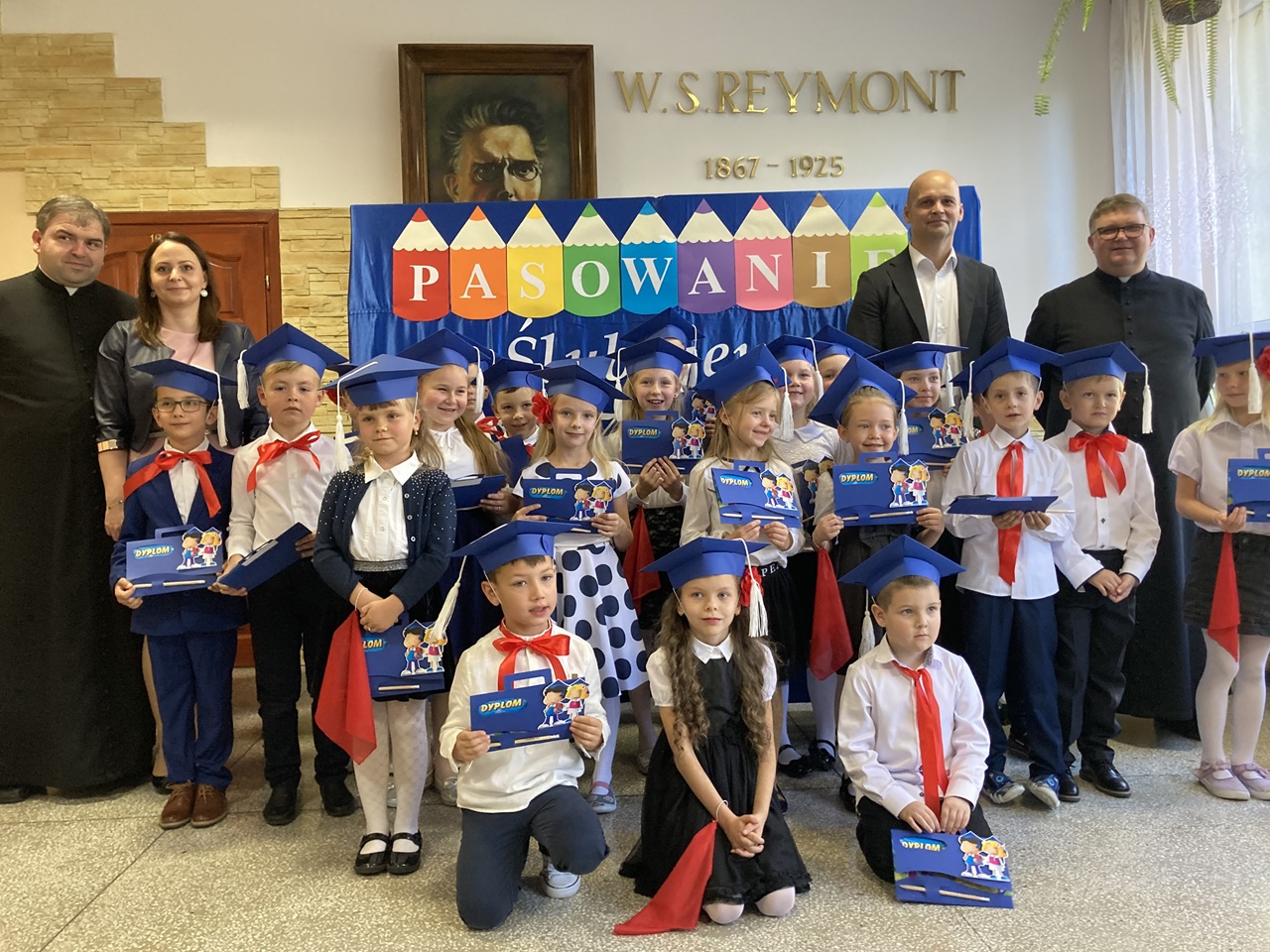 Dzieci otrzymały także pamiątkowe birety i dyplomy ufundowane przez rodziców. Następnie głos zabrał Pan Dyrektor, który życzył pierwszoklasistom wielu sukcesów w karierze szkolnej, a następnie przekazał podarunki od Wójta Gminy – Jana Skrzekuta. Na zakończenie przedstawiciele klasy II i III złożyli młodszym kolegom życzenia i wręczyli pamiątkowe upominki. Także opiekun SKO wręczył dzieciom gadżety ufundowane przez Bank Spółdzielczy w Limanowej.
