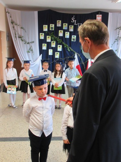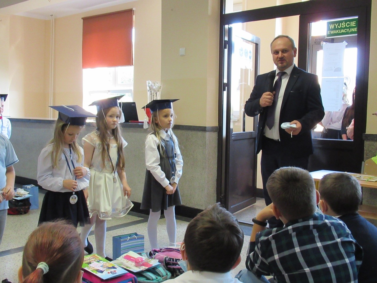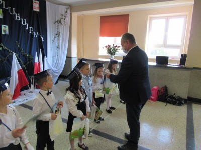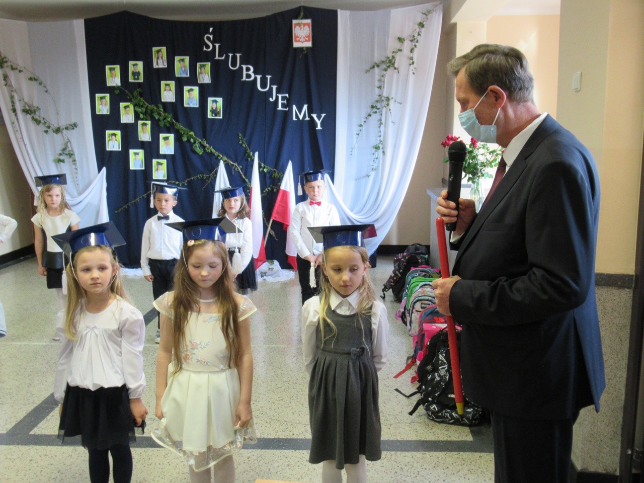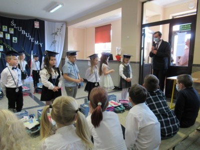 Po odczytaniu tekstu ślubowania i złożeniu przyrzeczenia, dyrektor szkoły dokonał uroczystego pasowania. Potwierdzeniem przyjęcia do społeczności szkolnej są medale wręczone przez pana Wójta oraz legitymacje i pamiątkowe dyplomy. Ważnym momentem tej uroczystości było poświęcenie przez ks. Proboszcza plecaków, podręczników i przyborów szkolnych.