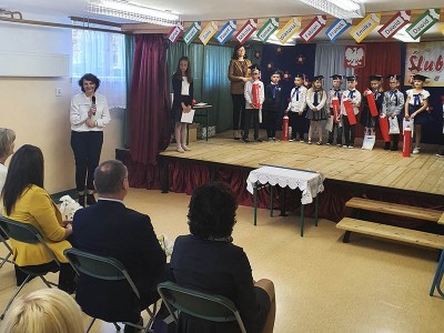 Wszystkich zebranych w pięknie przystrojonej sali powitała Dyrektor Szkoły Pani Józefa Setlak. Zanim uczniowie klasy pierwszej zostali przyjęci do grona społeczności szkolnej musieli przedstawić to, czego już się w szkole nauczyli. Gotowi, odświętnie ubrani i bardzo przejęci przystąpili do zaprezentowania swoich umiejętności. Z przejęciem recytowali wiersze i śpiewali piosenki. Po zakończonej prezentacji nastąpiło ślubowanie pierwszoklasistów, które wzbudziło wiele emocji. W niezwykle podniosłej atmosferze, przed pocztem sztandarowym uczniowie klasy pierwszej ślubowali być dobrymi Polakami, godnie reprezentować swoją szkołę, swoim zachowaniem i nauką sprawiać radość rodzicom i nauczycielom, pomagać każdemu potrzebującemu pomocy.