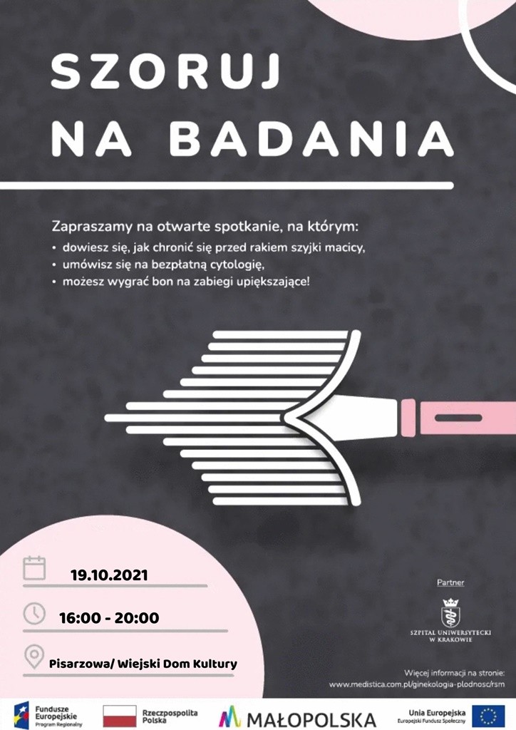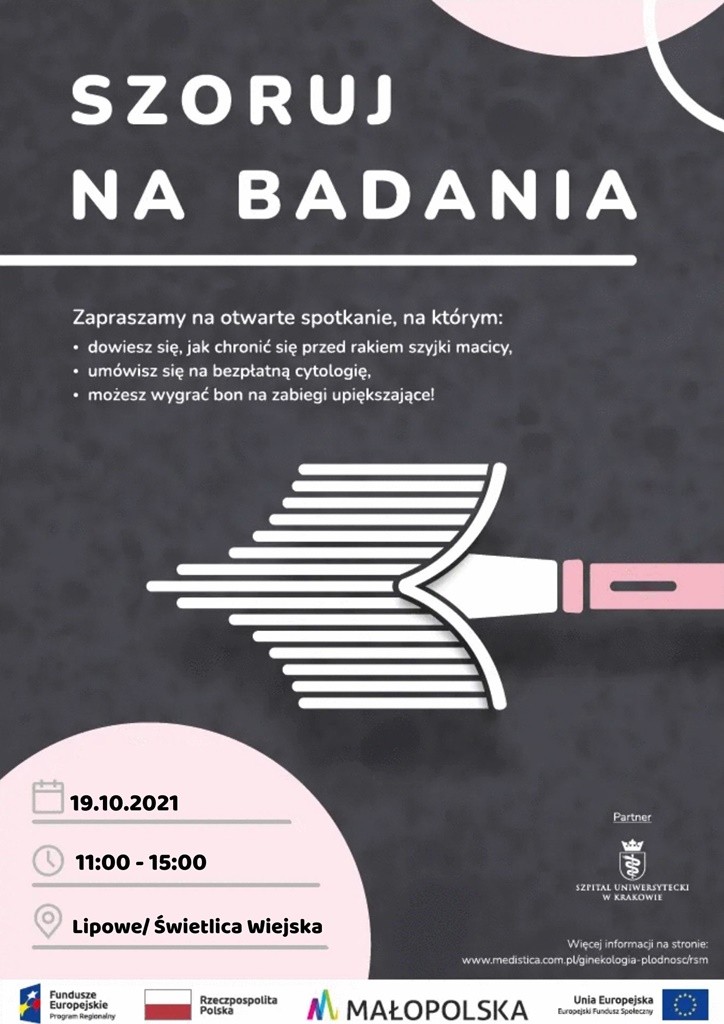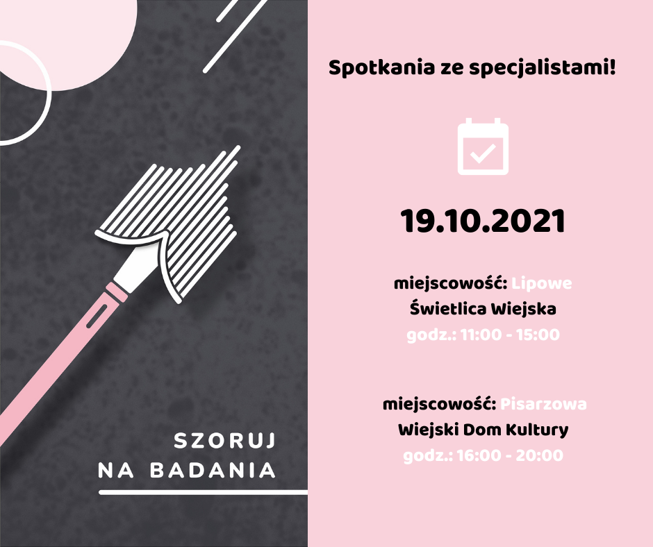 Zapraszamy Panie na spotkania poświęcone profilaktyce raka szyjki macicy, które odbędzie się 19 października, tj. w najbliższy wtorek w Świetlicy Wiejskiej w Lipowem godz. 11.00, a następnie w Wiejskim Domu Kultury w Pisarzowej o 16.00.