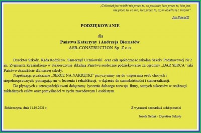 18 października 2021 roku gościliśmy w naszej szkole Pana Andrzeja Biernata - właściciela Firmy ASB-CONSTRUCTION.  Mieliśmy okazję podziękować Mu osobiście za przekazany naszej szkole piękny prezent w formie „Serca na nakrętki”. Jakże miło jest, gdy to były uczeń naszej szkoły wykazuje się  inicjatywą, która ma większy zasięg niż ten - lokalny, bowiem przyczyni się do pomocy osobom chorym i niepełnosprawnym. Napełniając serce nakrętkami wesprzemy tych, którzy potrzebują naszej pomocy, a dzięki Państwu Katarzynie i Andrzejowi Biernatom możemy uczynić to z jeszcze większą radością.