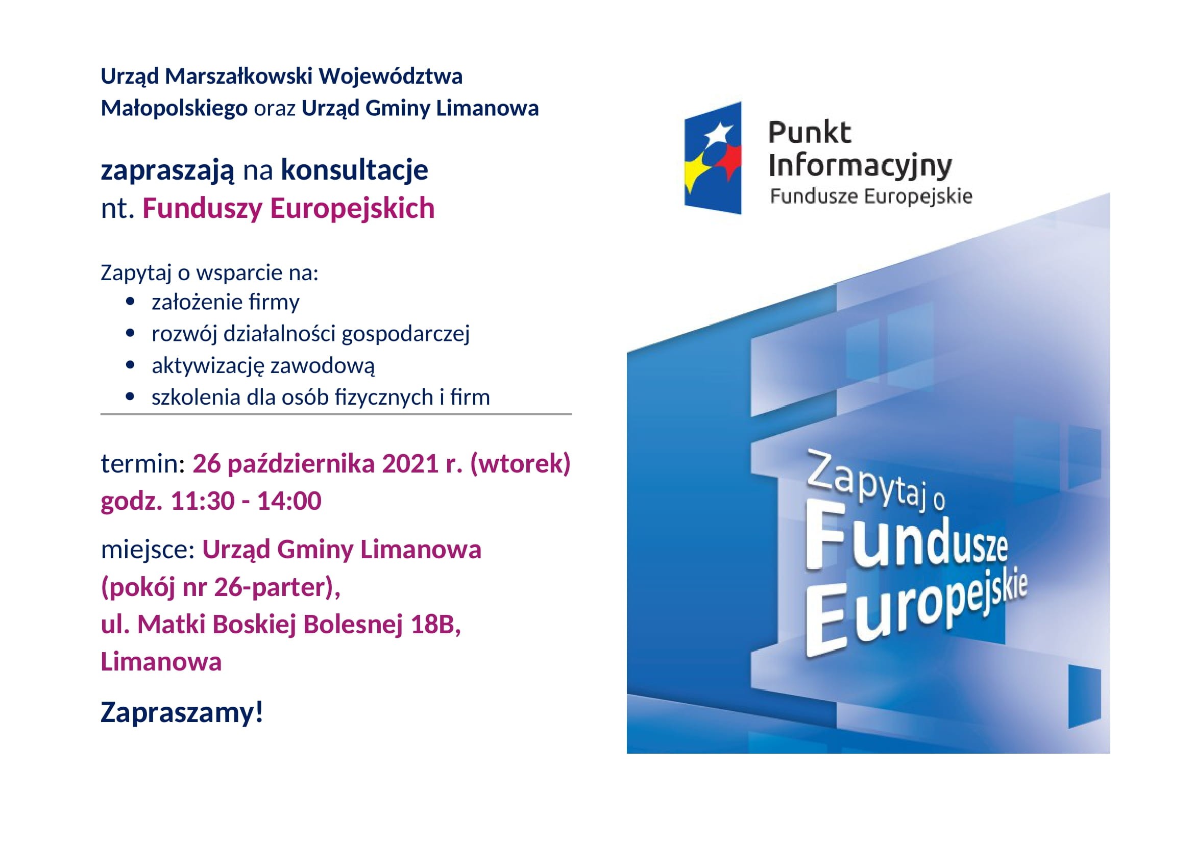 Zapraszamy na bezpłatne indywidualne konsultacje dotyczące funduszy unijnych, które odbędą się we wtorek, 26 października 2021 r. w godz. 11.30-14.00 w Urzędzie Gminy Limanowa, na parterze w pokoju nr 26.