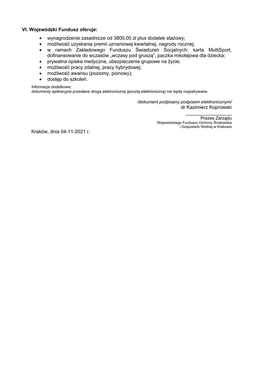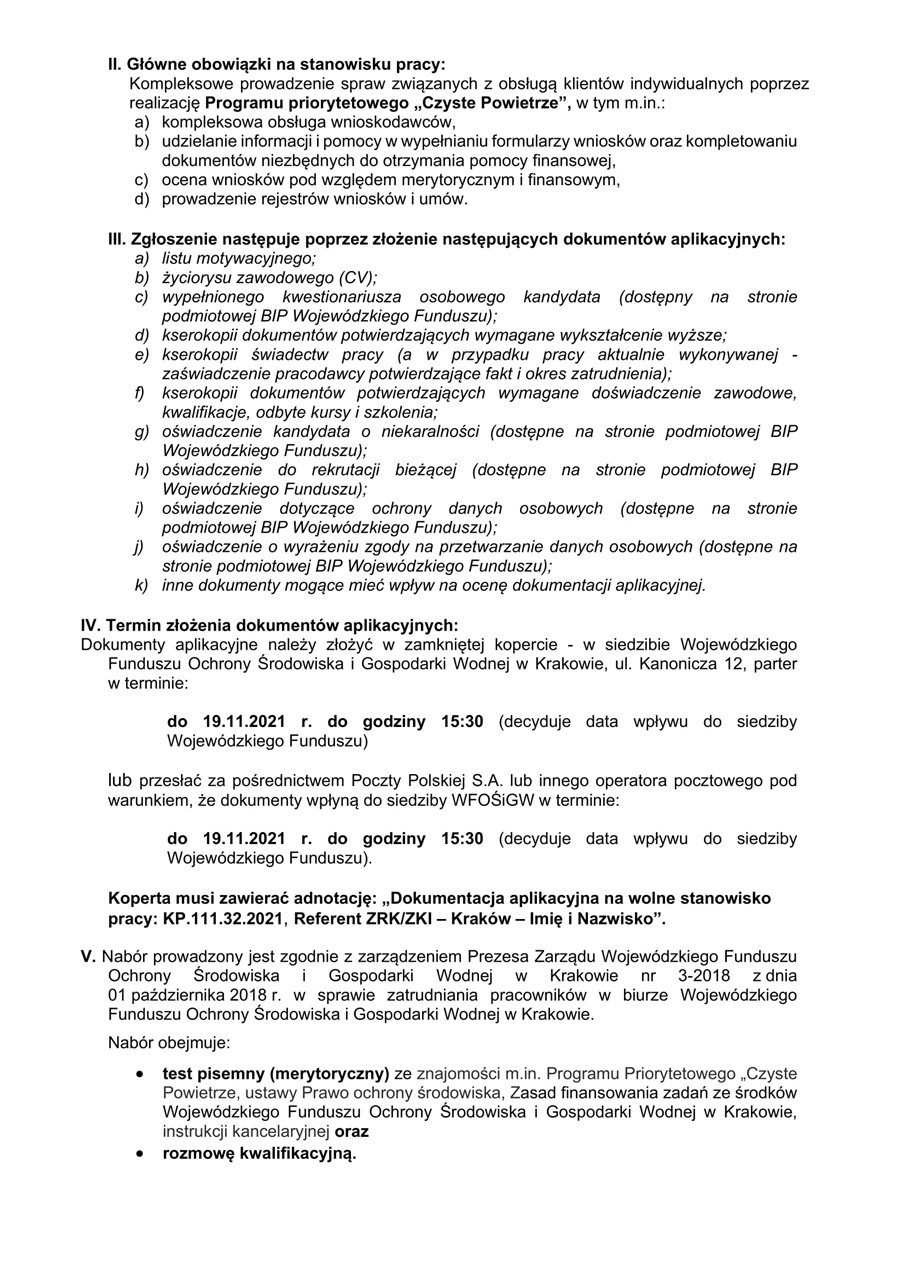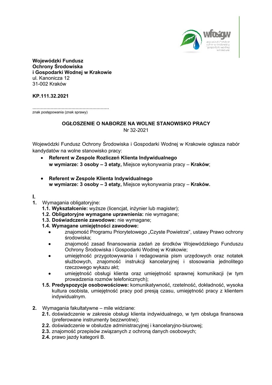 Ogłoszenie o naborze na wolne stanowiska pracy w krakowskim WFOŚiGW /nr 32