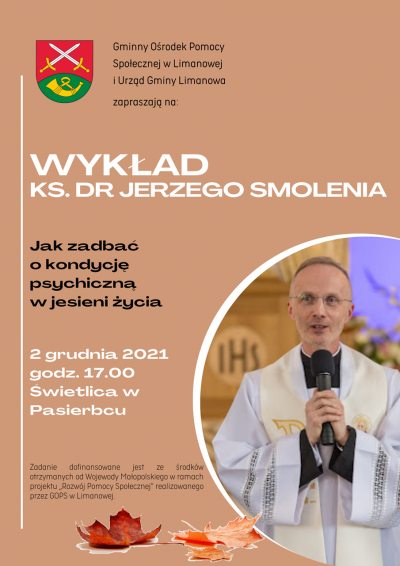 Gminny Ośrodek Pomocy Społecznej w Limanowej oraz Urząd Gminy Limanowa zapraszają na wykład Ks. dr Jerzego Smolenia pt. "Jak zadbać o kondycję psychiczną w jesieni życia", który odbędzie się 2 grudnia 2021 r. o godzinie 17.00 w świetlicy w Pasierbcu.