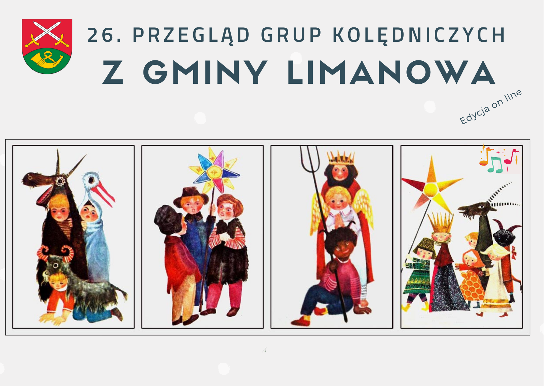 Chętne grupy kolędnicze z terenu gminy Limanowa zapraszamy do udziału w 26.Gminnym Przeglądzie Grup Kolędniczych. Z uwagi na stan pandemii Przegląd organizowany w wersji on-line. Zachęcamy do nadsyłania nagrań z występów kolędniczych, w myśl regulaminowych zapisów. Na filmiki z kolędowaniem czekamy do 10 stycznia 2022 roku.