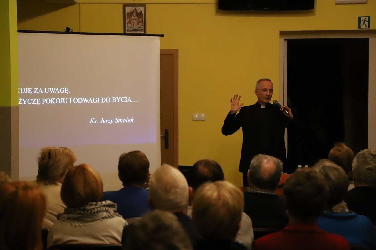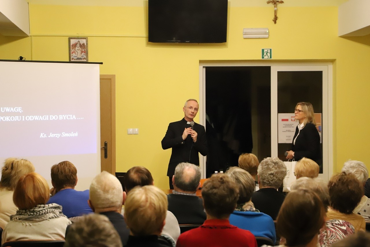 Następnie głos zabrał Ks. dr Jerzy Smoleń. Zwrócił uwagę na problem wzrostu samobójstw wśród osób starszych w ostatnim czasie. Prelegent położył nacisk, iż powinniśmy pielęgnować pewność w sobie (nie mylić z pewnością siebie), niezależnie, co o nas powiedzą inni. Jak akcentował, nasze poczucie własnej wartości zabija dzisiaj niepokój, lęk, porównywanie się wzajemne, a każdy z nas jest przecież inny, ma inną drogę. Porównanie prowadzi zaś do zazdrości, a ta również potrafi zabijać. Wśród zabójców naszej kondycji psychicznej są także perfekcjonizm i narzekanie, które jak dowiedli naukowcy, zmienia strukturę naszego mózgu, zmienia naszą osobowość na osobowość narzekającą. W zachowaniu higieny psychicznej może nam natomiast pomóc kilkanaście zasad. Są to m.in.: dążenie do zachowania równowagi pomiędzy obowiązkami a wypoczynkiem, danie sobie prawa do rozwijania swoich talentów w jesieni życia, nie banie się spędzania czasu samotnie. Jak dalej wskazywał nasz Gość, nie możemy poddawać się po pierwszej porażce, zawsze jest dobry czas, aby powstać. Nie możemy ciągle rozpamiętywać przeszłości, musimy ją zamknąć, ale też nie możemy zamartwiać się przyszłością. Należy otworzyć się na zmiany - niekoniecznie „starych drzew się nie przesadza”, bo szczęście może czekać na tym nowym miejscu. Nie skupiajmy się na tym, na co nie mamy wpływu, nauczmy się odmawiać, nie użalajmy się nad sobą i pogódźmy z tym, że nie da się wszystkich zadowolić. Dajmy sobie czas, uznajmy, że nie będzie natychmiastowych rezultatów i że trzeba dać sobie prawo do błędów. Nie bójmy się konsultować ze specjalistami, aby podnieść swoją jakość życia. Na koniec Ks. dr Smoleń życzył wszystkim obecnym pokoju i odwagi do bycia...