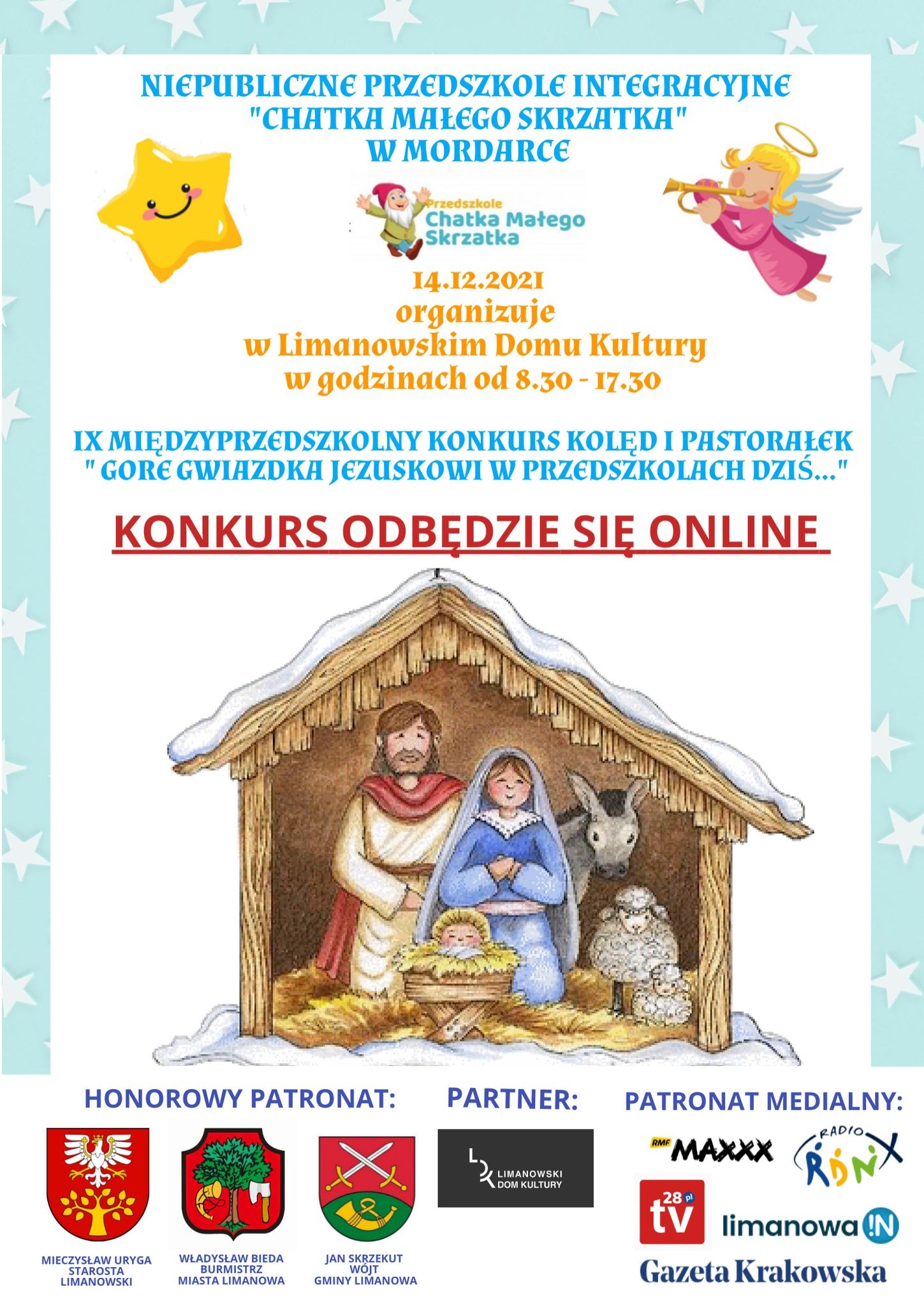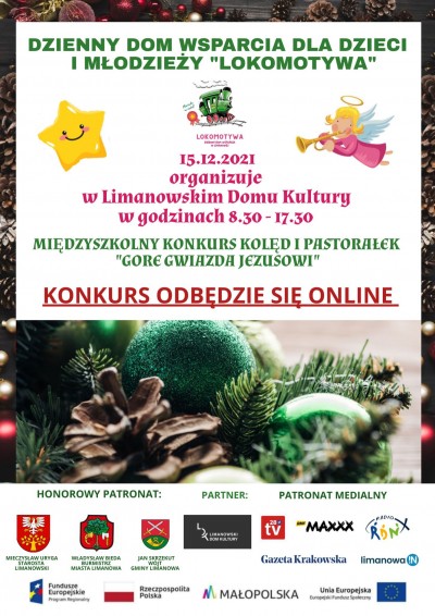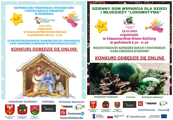 Ze względu na rozporządzenie Ministra Zdrowia i wprowadzenie ograniczeń, ale przede wszystkim dbając o bezpieczeństwo uczestników, informujemy, że tegoroczny Konkurs Kolęd i Pastorałek „Gore Gwiazdka Jezuskowi w przedszkolach dziś…” oraz Międzyszkolny Konkurs Kolęd i Pastorałek „Gore Gwiazda Jezusowi” przybiera formę online.