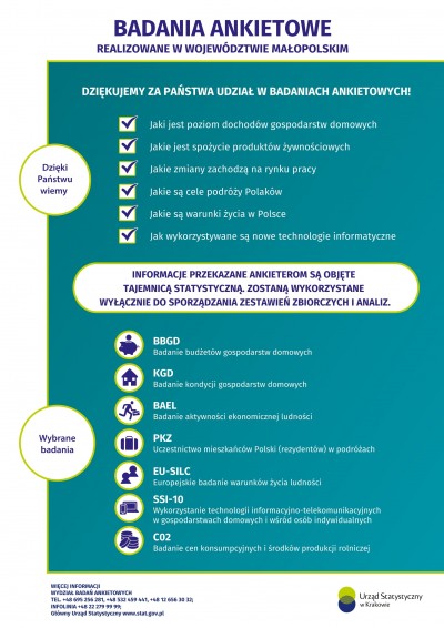 Urząd Statystyczny w Krakowie każdorazowo przekazuje szczegółowe informacje na temat realizowanych badań statystycznych, potwierdza autentyczność legitymacji lub tożsamość ankietera. Informacje takie, w przypadku badań ankietowych, można uzyskać u kierownika Wydziału Badań Ankietowych, pani Joanny Klimont – tel. 12 656 30 32 lub