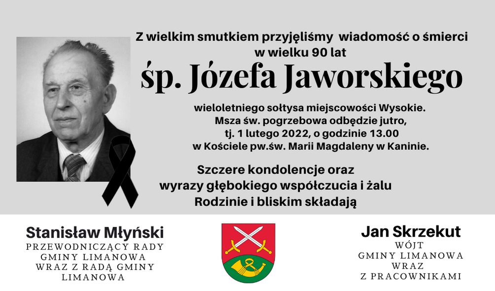 Z wielkim smutkiem przyjęliśmy wiadomość o śmierci w wielku 90 lat śp. Józefa Jaworskiego wieloletniego sołtysa miejscowości Wysokie.