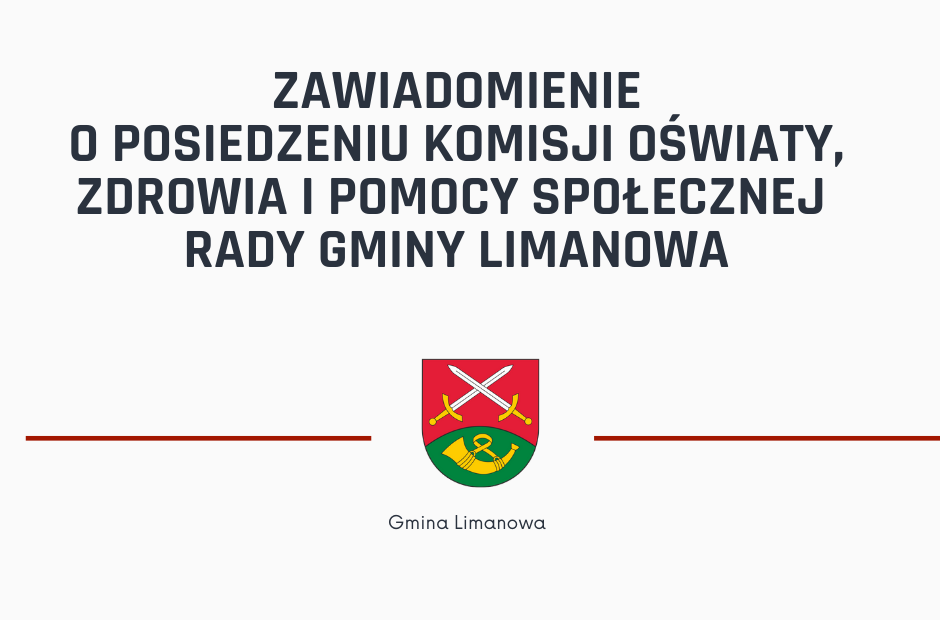 Na podstawie § 60 ust. 1 i ust. 3 uchwały Nr XXIX/278/2018 Rady Gminy Limanowa z dnia 6 września 2018 r. w sprawie Statutu Gminy Limanowa (Dz. Urz. Woj. Mał. z 2018 r. poz. 6395) zapraszam na posiedzenie Komisji Oświaty, Zdrowia i Pomocy Społecznej Rady Gminy Limanowa, które odbędzie się w dniu 10 stycznia 2022 r. /poniedziałek/ o godz. 14:00 w sali konferencyjnej Urzędu Gminy Limanowa.