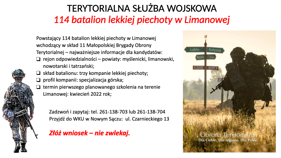 Dotyczy: naboru do terytorialnej służby wojskowej w ramach tworzenia 114 batalionu lekkiej piechoty w Limanowej