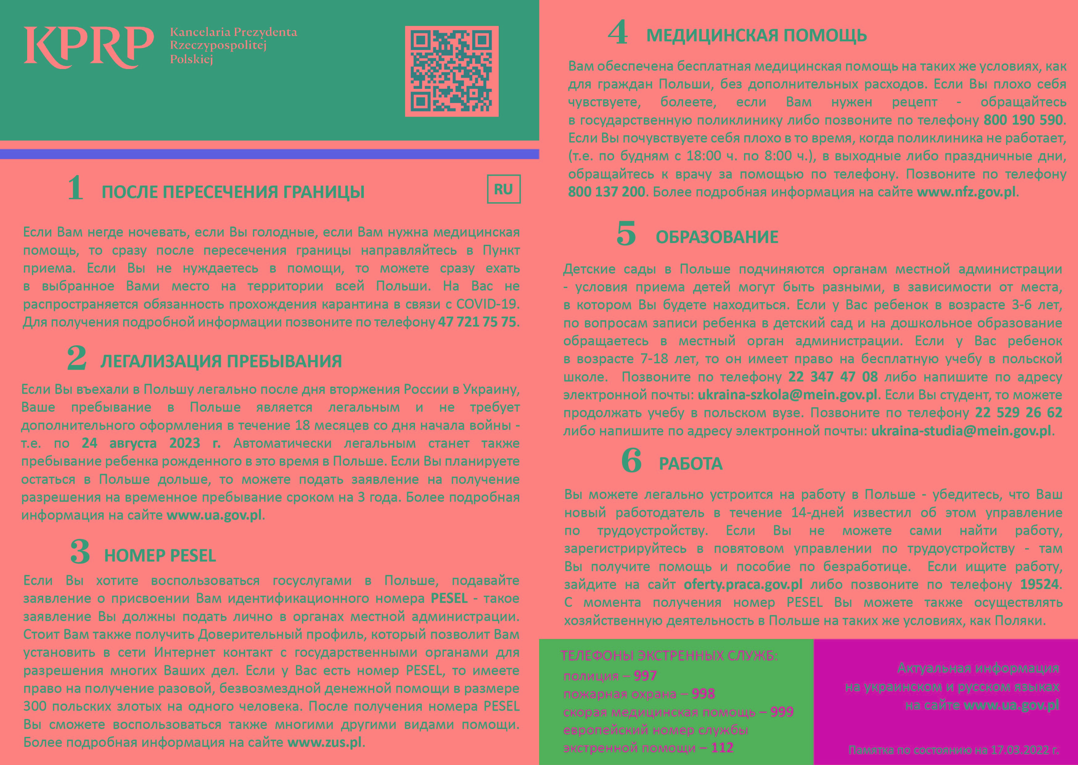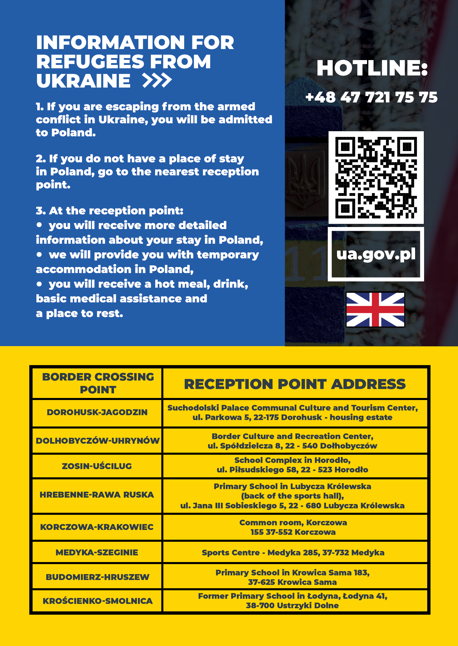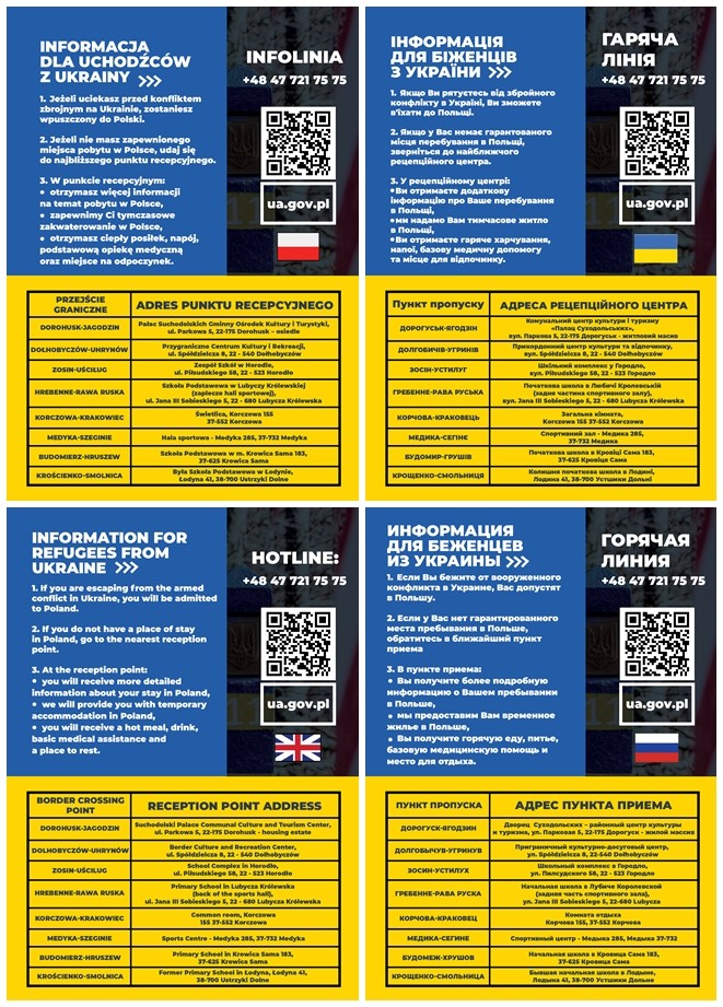 Pomoc oferowana przez Polski Rząd obywatelom Ukrainy odbywa się w PUNKTACH RECEPCYJNYCH, w których można otrzymać: