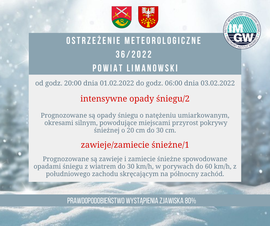 Ostrzeżenie meteorologiczne 36/2022 – intensywne opady śniegu, zawieje i zamiecie śnieżne