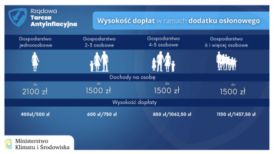 *Podwyższenie kwoty dofinansowania jest uzależnione od źródła ogrzewania – wyższa kwota dodatku przysługuje w przypadku, gdy głównym źródłem ogrzewania gospodarstwa domowego jest kocioł na paliwo stałe, kominek, koza, ogrzewacz powietrza, trzon kuchenny, piecokuchnia, kuchnia węglowa lub piec kaflowy na paliwo stałe, zasilane węglem lub paliwami węglopochodnymi, wpisane do centralnej ewidencji emisyjności budynków, o której mowa w art. 27a ust. 1 ustawy z dnia 21 listopada 2008 r. o wspieraniu termomodernizacji i remontów oraz o centralnej ewidencji emisyjności budynków (Dz. U. z 2021 r. poz. 554, 1162 i 1243).