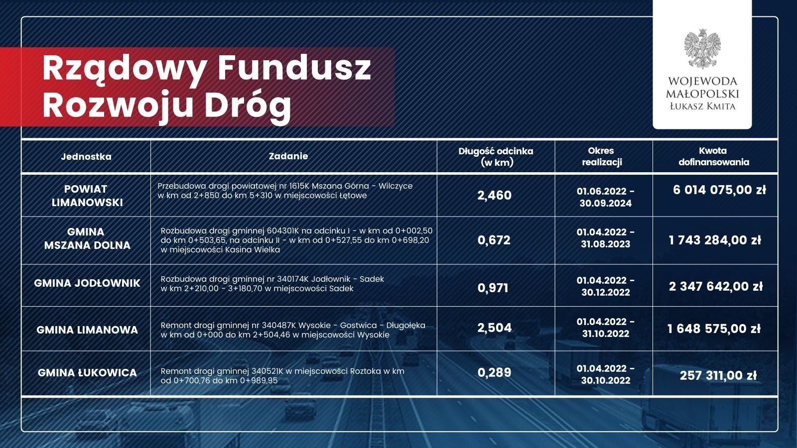 Gmina Limanowa otrzymała dofinansowanie w kwocie 1 648 575 zł  z Rządowego Funduszu Rozwoju Dróg na zadanie "Remont drogi gminnej nr 340487K Wysokie - Gostwica - Długołęka w km od 0+000 do km 2+504,46 w miejscowości Wysokie, Gmina Limanowa”.
