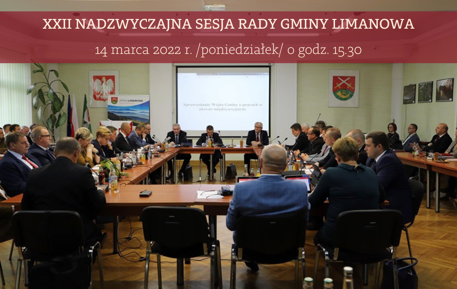 Na podstawie art. 20 ust. 1 ustawy z dnia 8 marca 1990 r. o samorządzie gminnym (t.j. Dz. U. z 2021 poz. 1372 ze zm.) zwołuję i zapraszam na XXII nadzwyczajną sesję Rady Gminy Limanowa, która odbędzie się w dniu 14 marca 2022 r. /poniedziałek/ o godz. 15:30 w sali konferencyjnej Urzędu Gminy Limanowa.