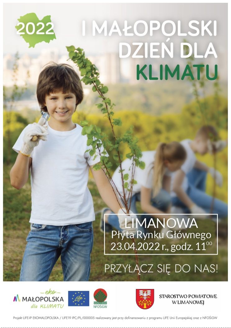Już dzisiaj zapraszamy na I Małopolski Dzień dla Klimatu w Powiecie Limanowskim, który odbędzie się 23 kwietnia 2022 r. (sobota) na płycie rynku w Limanowej i rozpocznie się od godziny 11:00.