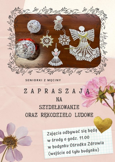 Każdego kto ma ochotę i trochę wolnego czasu SENIORKI Z MĘCINY zapraszają na zajęcia z szydełkowania, które odbywać się będą w środy o godzinie 11.00 w budynku Ośrodka Zdrowia (wejście od tyłu budynku).