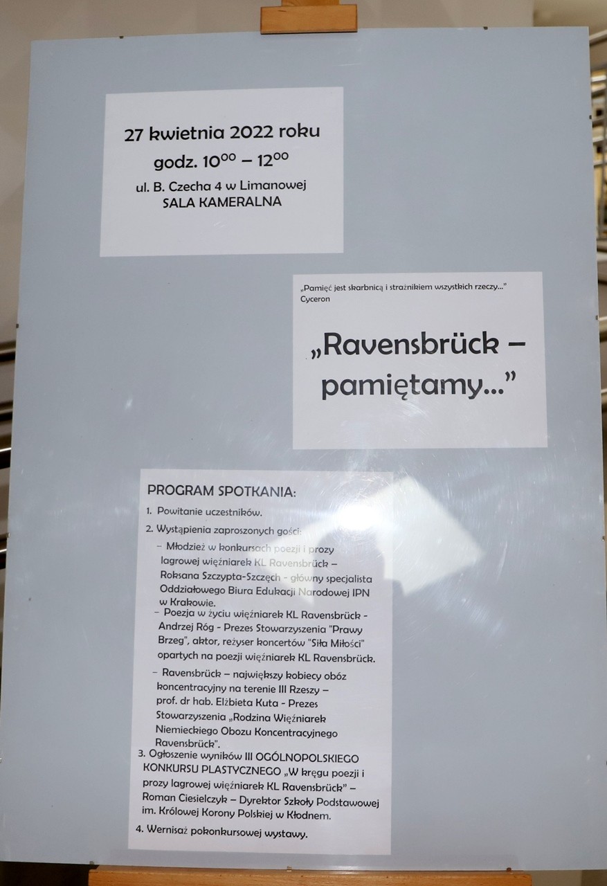 Finał III Ogólnopolskiego Konkursu Plastycznego „W kręgu poezji i prozy lagrowej więźniarek KL Ravensbrück” odbył się dnia 27 kwietnia 2022 r. w sali kameralnej Domu Kultury w Limanowej przy współpracy organizacyjnej z Pedagogiczną Biblioteką Wojewódzką w Nowym Sączu – Filia w Limanowej. Uroczystość połączona była z wystawą prac plastycznych i prelekcją skierowaną do młodzieży przez Panią prof. dr hab. Elżbietę Kutę – prezesa Stowarzyszenia „Rodzina Więźniarek Niemieckiego Obozu Koncentracyjnego Ravensbrück” oraz Pana Andrzeja Roga – aktora i wieloletniego reżysera koncertów „Siła Miłości” dedykowany więźniarkom KL Ravensbrück.