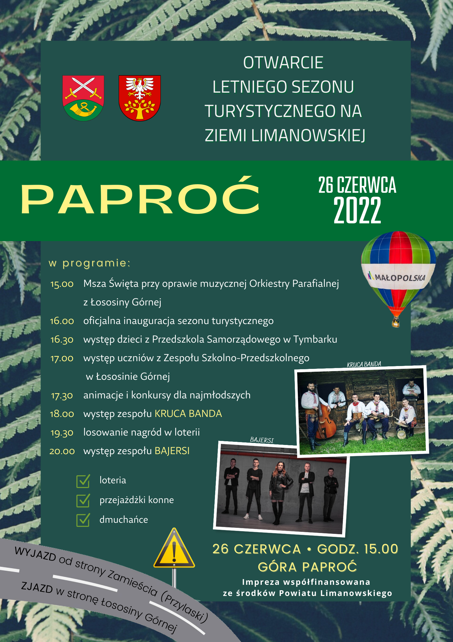 W niedziele, tj. 26 czerwca br. na górze Paproć (645 m n.p.m.) odbędzie się uroczyste Otwarcie Sezonu Turystycznego na Ziemi Limanowskiej. Imprezę jak co roku rozpocznie msza św., a po niej zaplanowany jest szereg atrakcji.