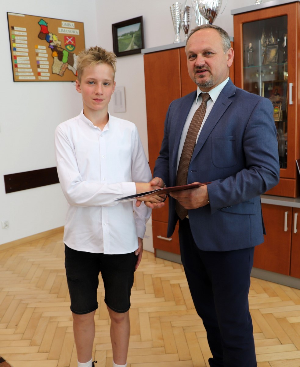 14 czerwca br. w siedzibie Urzędu Gminy zostały wręczone nagrody Wójta Gminy Limanowa za osiągnięcie wysokich wyników sportowych w 2021 roku. Zgodnie z uchwałą Nr XIV/160/2016 Rady Gminy Limanowa o takie wyróżnienie mogą starać się mieszkańcy Gminy Limanowa, którzy zdobyli najwyższe lokaty na podium podczas Mistrz Polski, Europy i Świata. Uchwała przewiduje również wyróżnienie osób, które osiągnęły szczególne wyniki sportowe na ogólnopolskich turniejach.