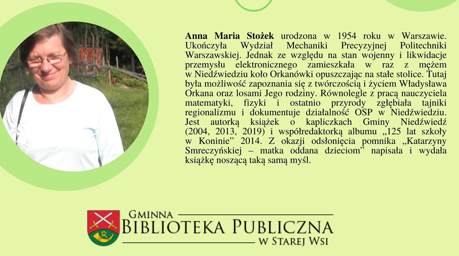 Gminna Biblioteka Publiczna w Starej Wsi zaprasza na spotkanie autorskie z Anną Marią Stożek pt. „Katarzyna Smerczyńska – matka oddana dzieciom”, który odbędzie się 23 czerwca  2022 r. /czwartek/ o godzinie 17.00 w Bibliotece Publicznej w Starej Wsi.