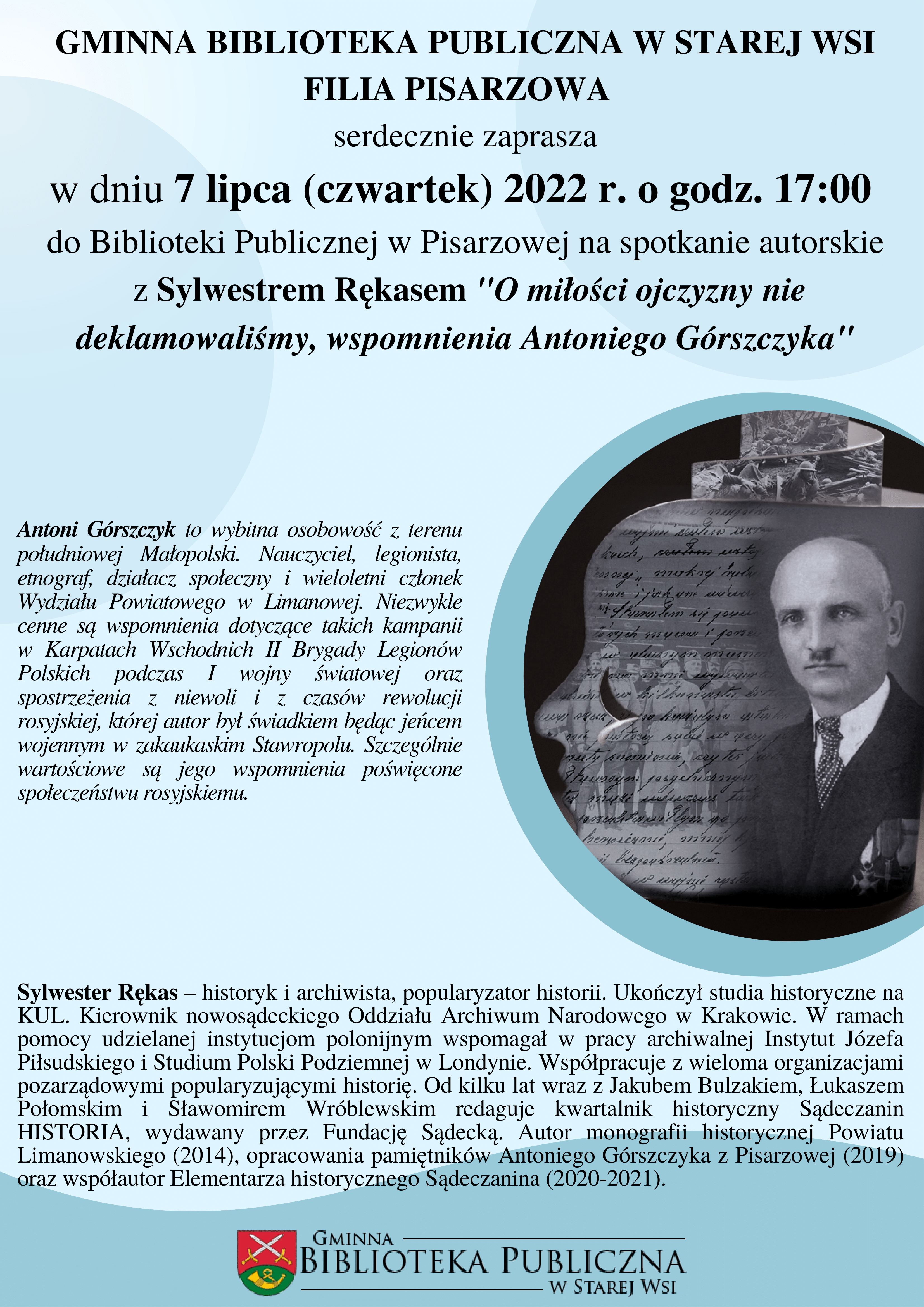 Gminna Biblioteka Publiczna w Starej Wsi Filia Pisarzowa zaprasza na spotkanie autorskie z Anną Sylwestrem Rękasem pt. „O miłości ojczyzny nie deklamowaliśmy, wspomnienia Antoniego Górszczyka”, które odbędzie się 7 lipca 2022 r. /czwartek/ o godzinie 17.00 w Bibliotece Publicznej w Pisarzowej.