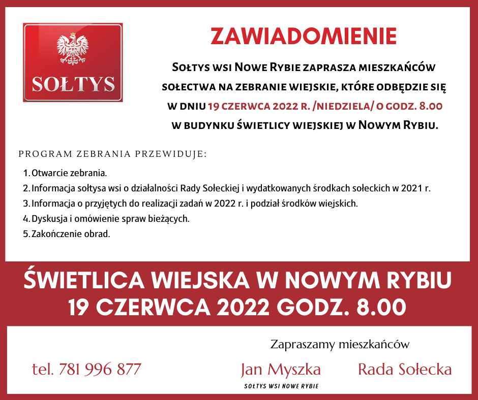 Sołtys wsi Nowe Rybie zaprasza mieszkańców sołectwa na zebranie wiejskie, które odbędzie się w dniu 19 czerwca 2022 r. /niedziela/ o godz. 8.00 w budynku świetlicy wiejskiej w Nowym Rybiu.
