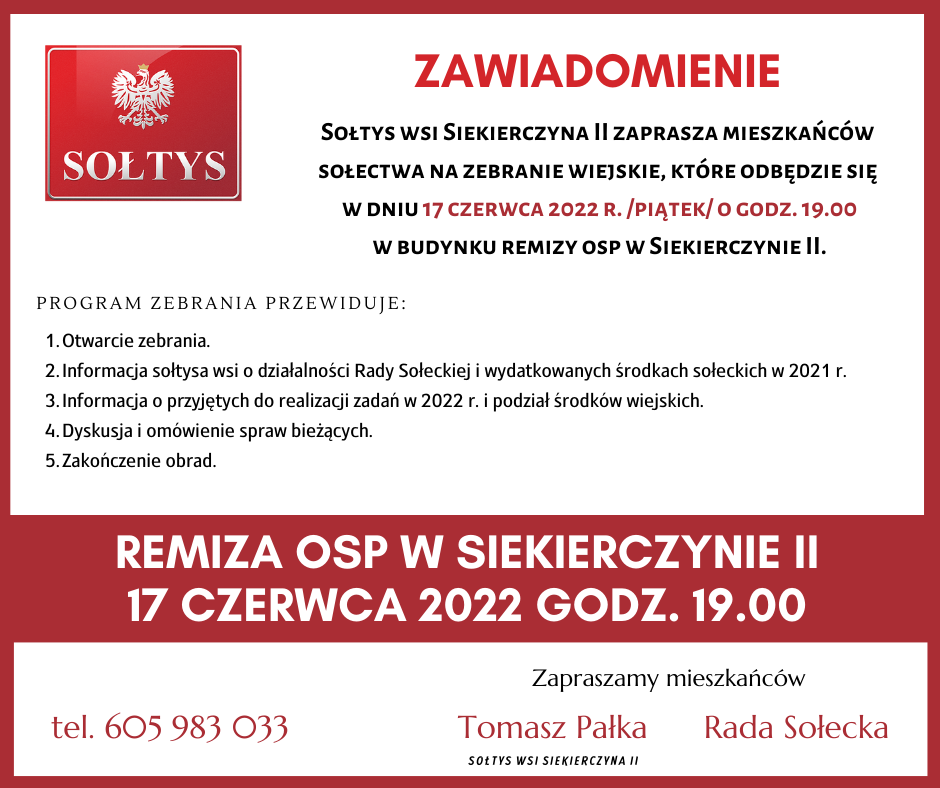 Sołtys wsi Siekierczyna II zaprasza mieszkańców sołectwa na zebranie wiejskie, które odbędzie się w dniu 17 czerwca 2022 r. /piątek/ o godz. 19.00 w budynku remizy  OSP w Siekierczynie II.