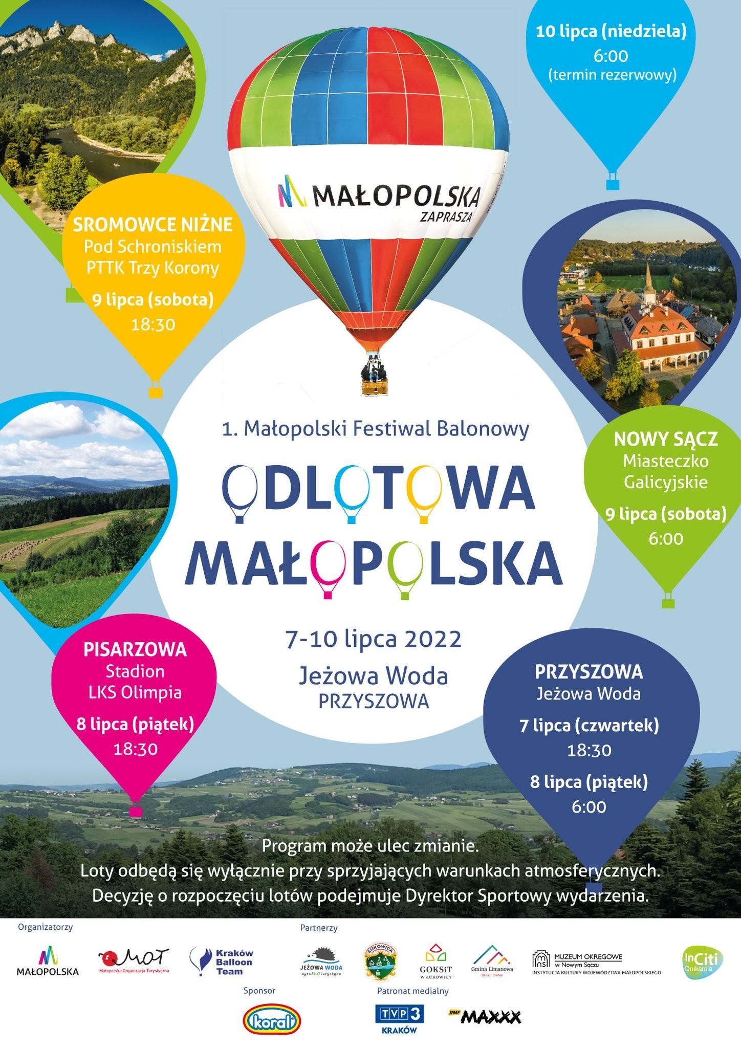 1. Małopolski Festiwal Balonowy odbędzie się w dniach 7-10 lipca br., a balony będzie można ujrzeć nad Przyszową, Pisarzową, Nowym Sączem i Sromowcami Niżnymi. Do walki o Puchar Marszałka Województwa Małopolskiego, który jest główną nagrodą pierwszej edycji „Odlotowej Małopolski", zgłosiło się aż 12 pilotów wraz z załogami! Ponadto będą rozgrywane jeszcze konkurencje o Puchar Prezesa Małopolskiej Organizacji Turystycznej, Puchar Wójta Gminy Łukowica oraz Puchar Wójta Gminy Limanowa. W trakcie festiwalu zaplanowane jest 5 lotów. W ich trakcie piloci wraz z załogami będą mogli zobaczyć piękne i malownicze zakątki południowej Małopolski: Beskid Sądecki, Beskid Wyspowy oraz Pieniny z Przełomem Dunajca. Loty odbędą się oczywiście w miarę możliwości pogodowych. A przy dobrej widoczności widzowie będą mogli zobaczyć piękne widoki w postaci balonów na tle Beskidów i Tatr.
