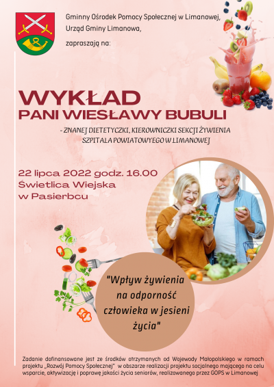 Gminny Ośrodek Pomocy Społecznej w Limanowej i Urząd Gminy Limanowa zapraszają na wykład znanej dietetyczki i kierowniczki Sekcji Żywienia Szpitala Powiatowego w Limanowej pt. „Wpływ żywienia na odporność człowieka w jesieni życia”, który odbędzie się 22 lipca 2022 r. o godzinie 16.00 w Świetlicy Wiejskiej w Pasierbcu.
