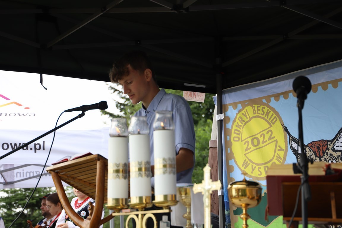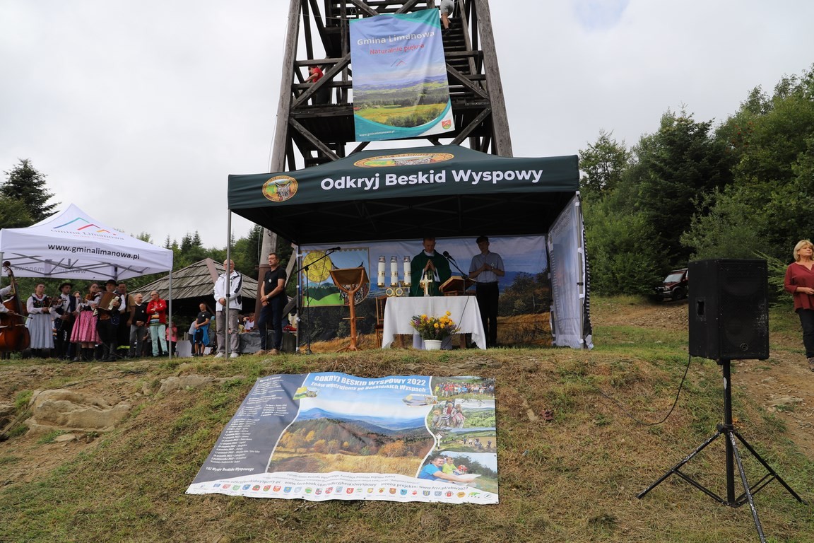 "ODKRYJ BESKID WYSPOWY 2022 – Znów wędrujemy po Beskidzkich Wyspach”. Na szczyt góry Jaworz turyści docierali z różnych stron, a główna grupa pod opieką przewodnika PTTK Jarosława Orła dotarła wędrując czerwonym szlakiem od strony Męciny przez górę Sałasz.
