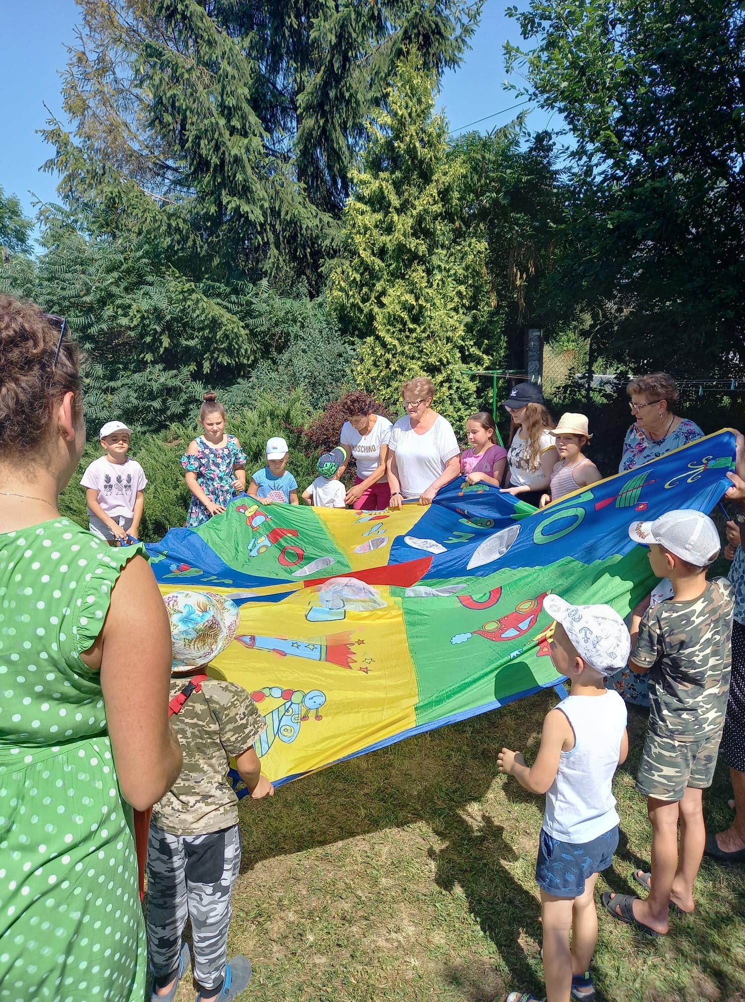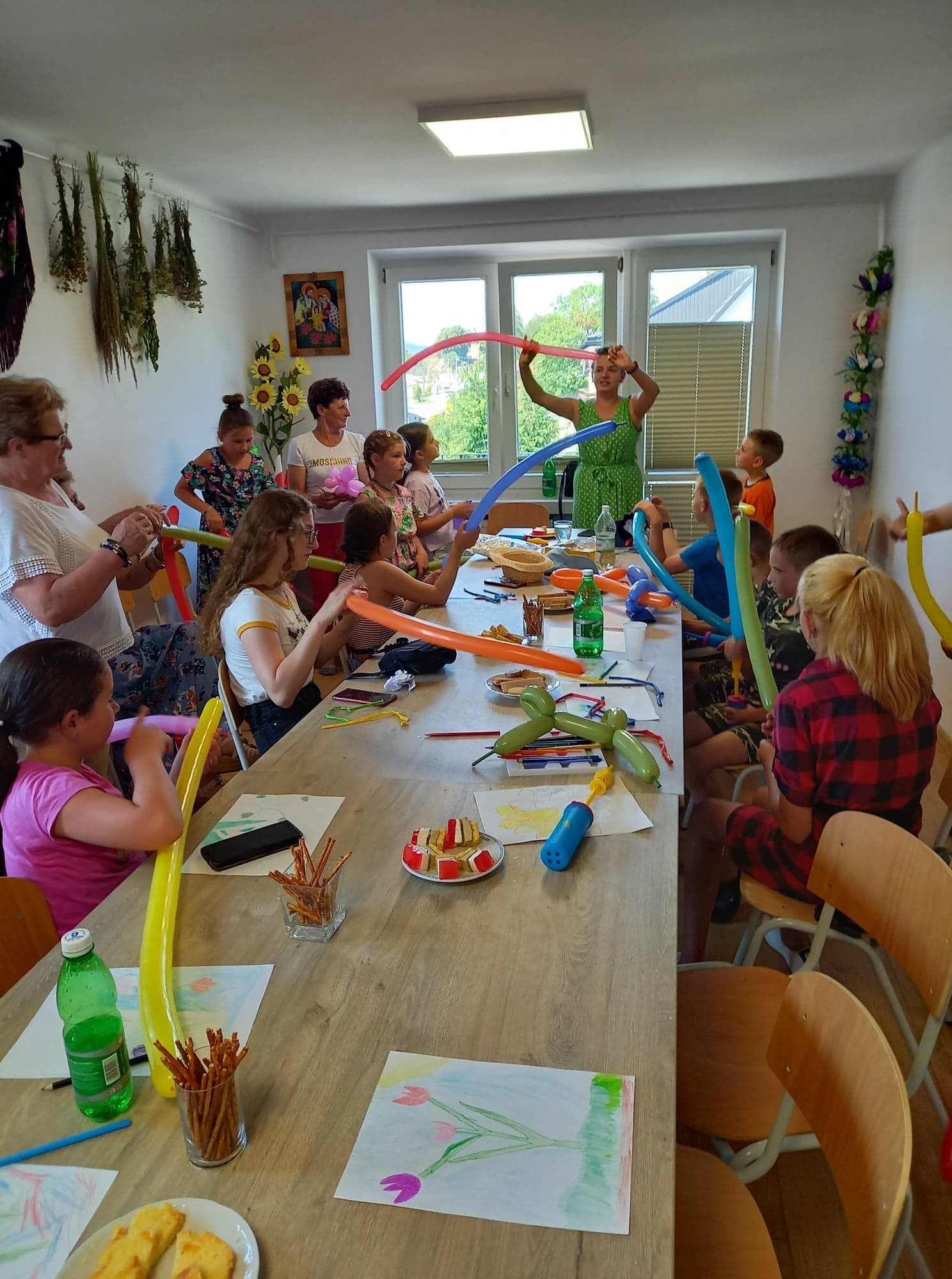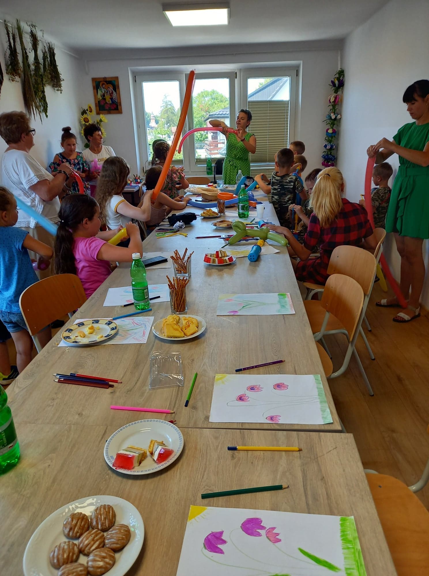 Na placu przed świetlicą gminną mieszczącej się w budynku Ośrodka Zdrowia w Męcinie zorganizowane zostały także kolorowe animacje dla dzieci, które poprowadziła przedstawicielka Fundacji Dzień Dobry. We wspólnej zabawie brały udział także dzieci z Ukrainy goszczące u Państwa Włodarczyków w Męcinie.