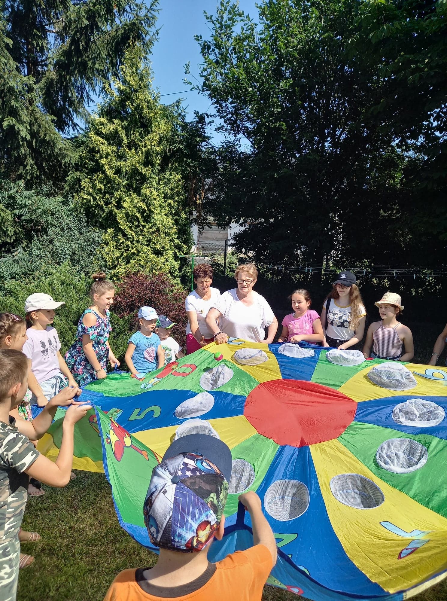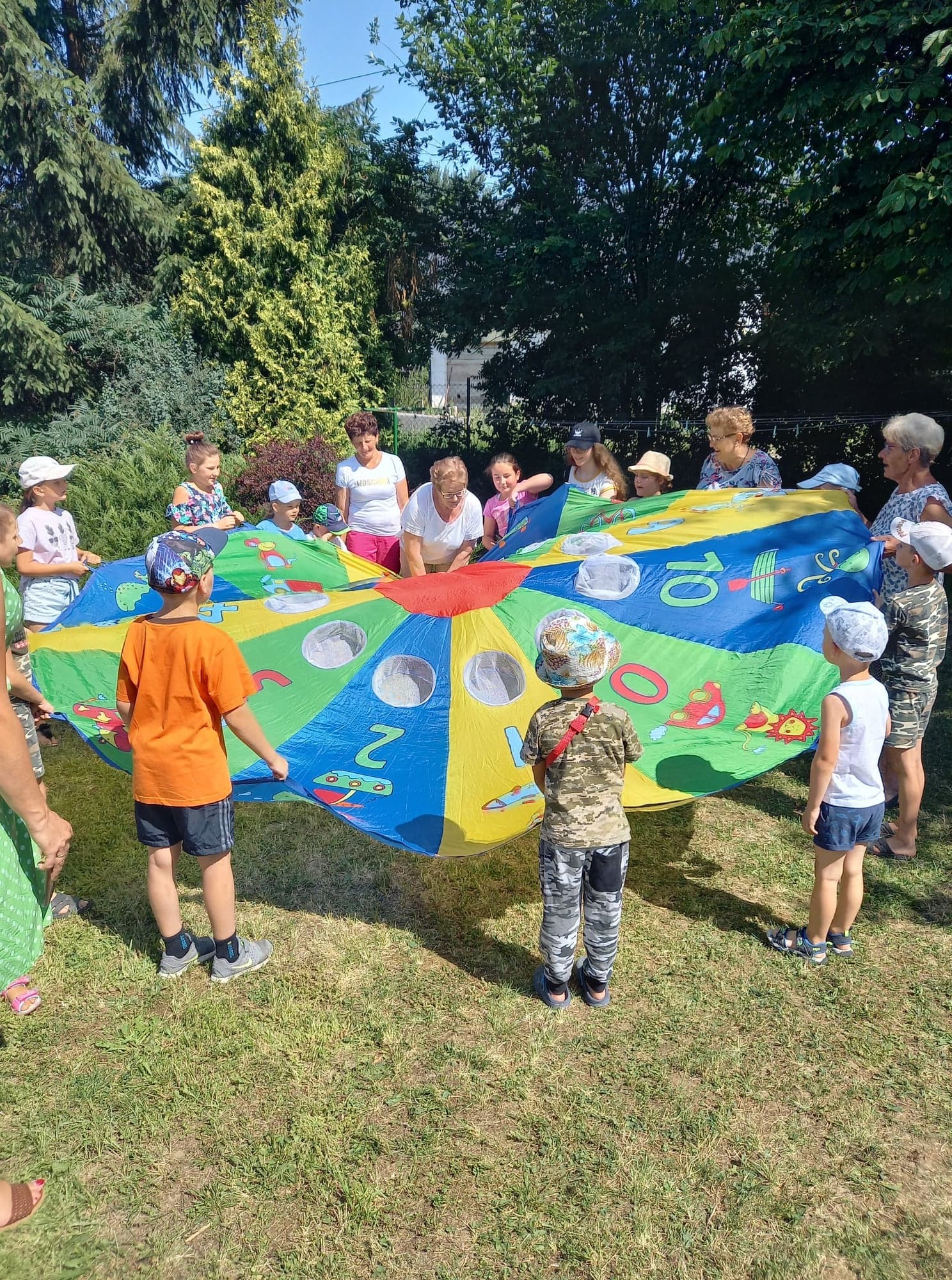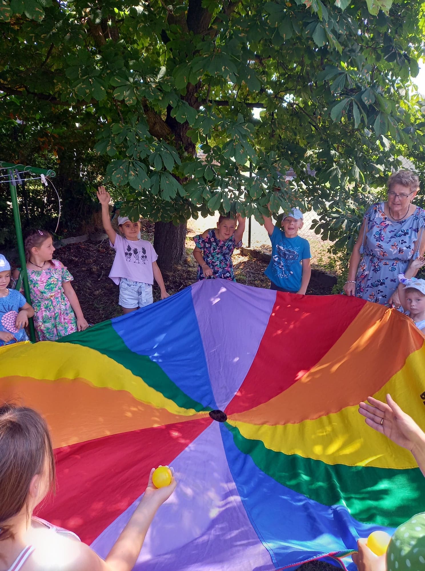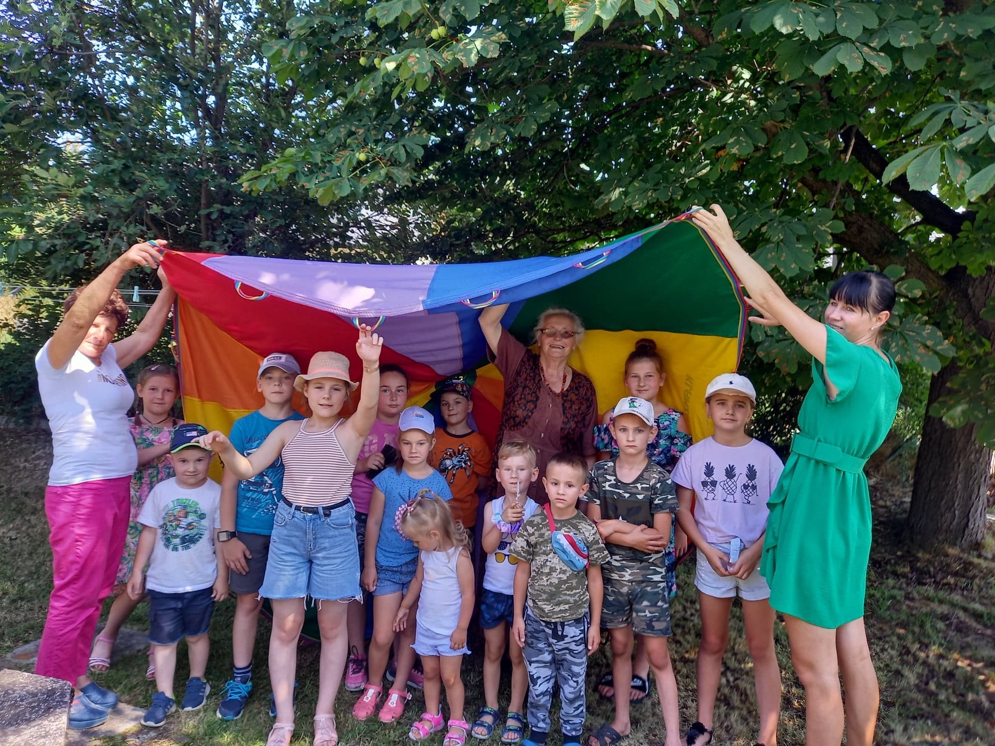 Na placu przed świetlicą gminną mieszczącej się w budynku Ośrodka Zdrowia w Męcinie zorganizowane zostały także kolorowe animacje dla dzieci, które poprowadziła przedstawicielka Fundacji Dzień Dobry. We wspólnej zabawie brały udział także dzieci z Ukrainy goszczące u Państwa Włodarczyków w Męcinie.