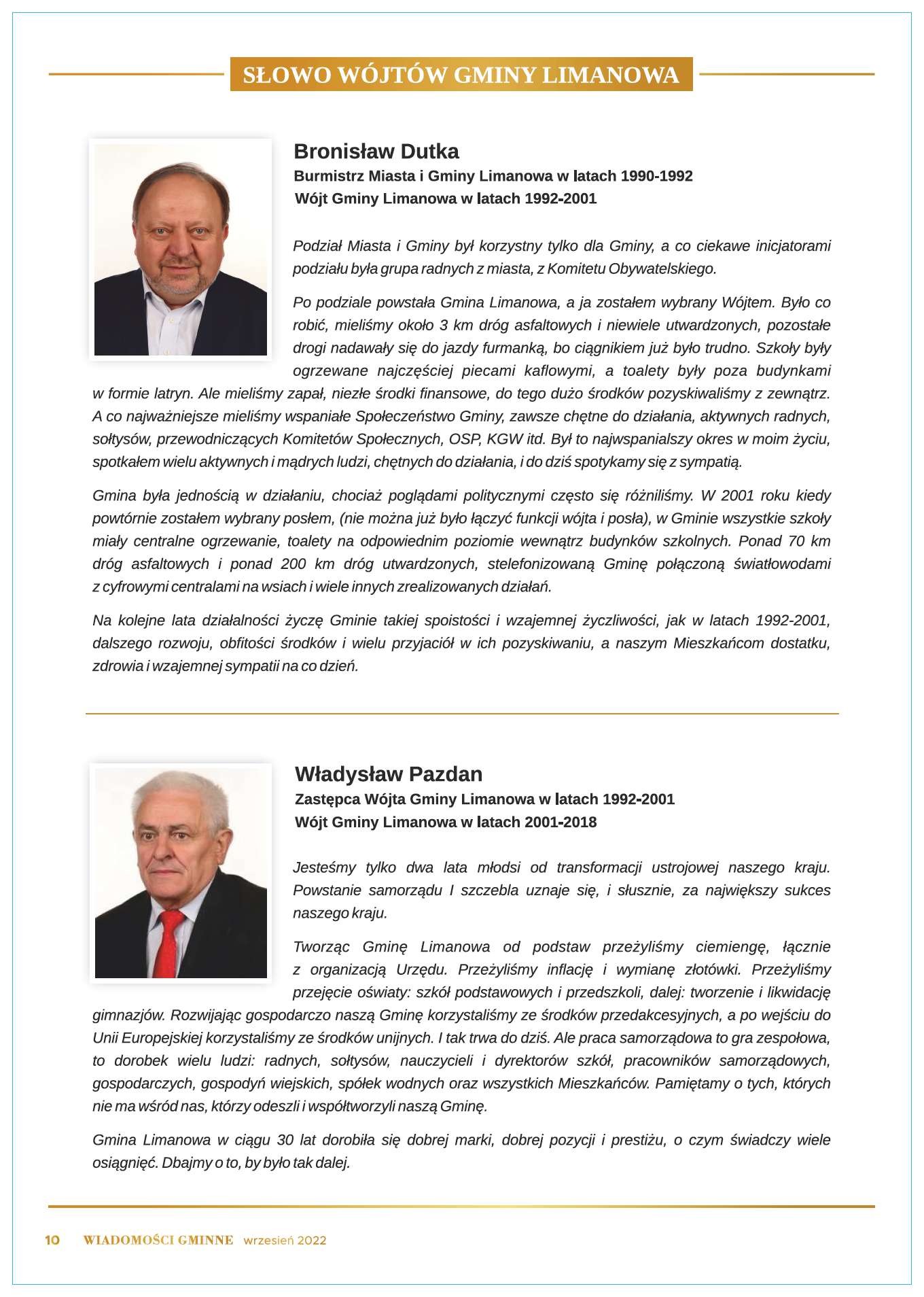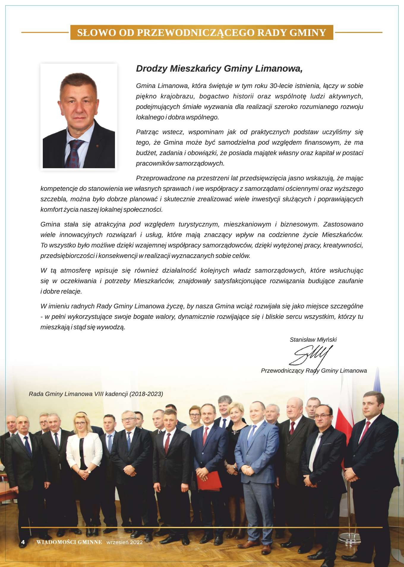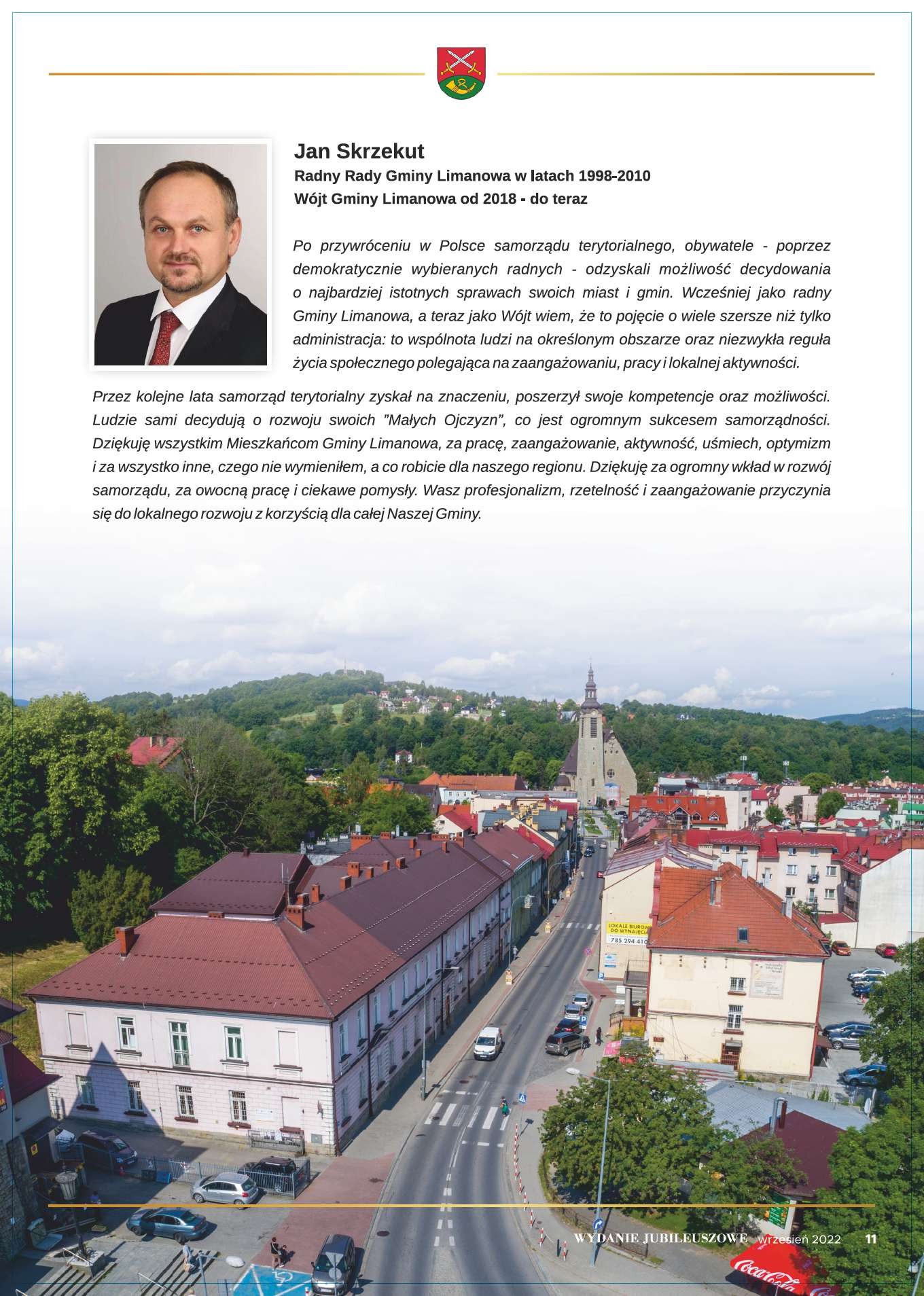 Przez kolejne lata samorząd terytorialny zyskał na znaczeniu, poszerzył swoje kompetencje oraz możliwości. Ludzie sami decydują o rozwoju swoich ”Małych Ojczyzn”, co jest ogromnym sukcesem samorządności. Dziękuję wszystkim Mieszkańcom Gminy Limanowa, za pracę, zaangażowanie, aktywność, uśmiech, optymizm i za wszystko inne, czego nie wymieniłem, a co robicie dla naszego regionu. Dziękuję za ogromny wkład w rozwój samorządu, za owocną pracę i ciekawe pomysły. Wasz profesjonalizm, rzetelność i zaangażowanie przyczynia się do lokalnego rozwoju z korzyścią dla całej Naszej Gminy.”