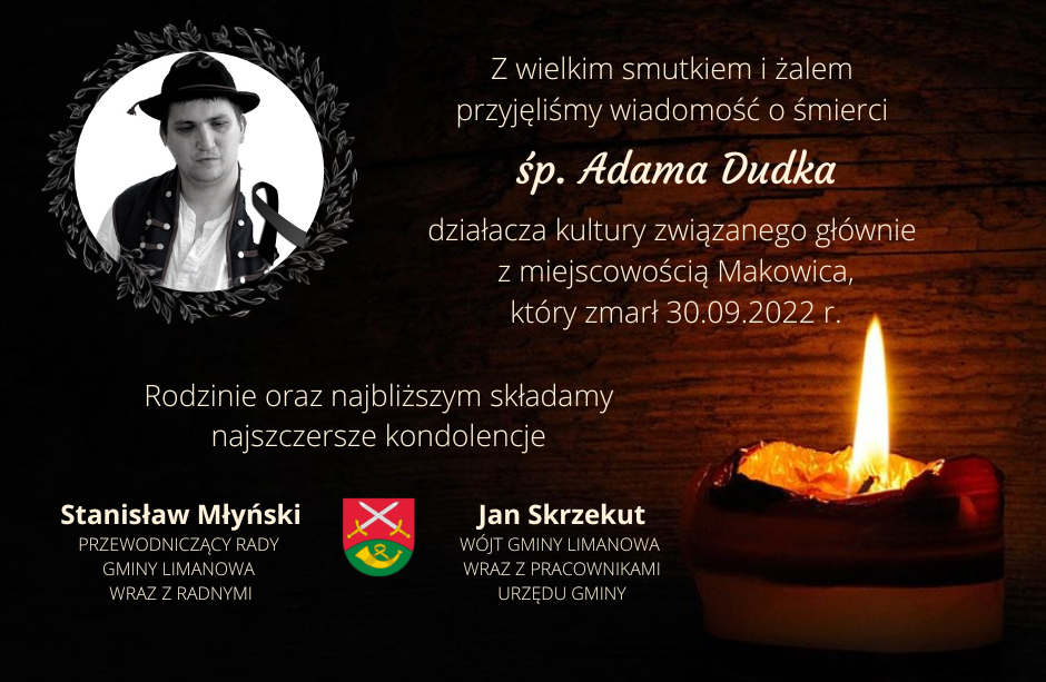 Z wielkim smutkiem i żalem przyjęliśmy wiadomość o śmierci w dniu dzisiejszym śp. Adama Dudka dzialacza kultury związanego główni z miejscowością Makowica. Rodzinie szczególnie żonie Magdalenie Dudek przewodniczącej Koła Gospodyń Wiejskich w Makowicy składamy najszczersze kondolencje .