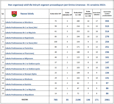 Stan organizacji szkół Gminy Limanowa na dzień 1 września 2022 r. obrazuje poniższa tabela: