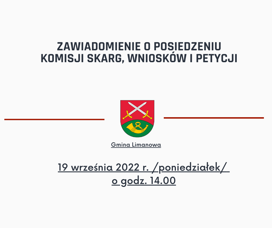 19 września 2022 r. /poniedziałek/ o godz. 14.00 w sali konferencyjnej Urzędu Gminy Limanowa.