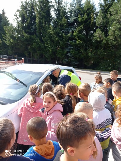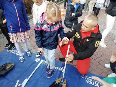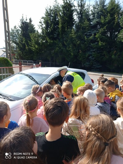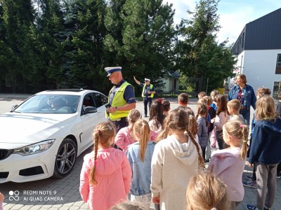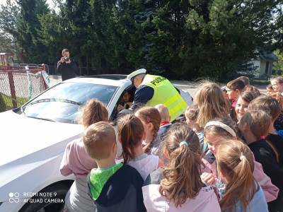 Spotkanie rozpoczęło się od pogadanki. Policjanci rozmawiali z dziećmi o bezpieczeństwie oraz zasadach obowiązujących na drodze, zwracając uwagę, że o zachowaniu bezpieczeństwa muszą pamiętać wszyscy! Nie tylko kierowcy, ale również Ci, którzy w jakikolwiek sposób są uczestnikami ruchu drogowego.