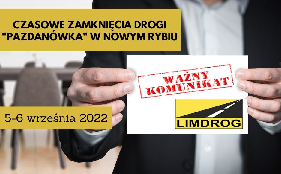 Przedsiębiorstwo Drogowo - Mostowe LIMDROG Sp. z o. o z siedzibą ul. M.B. Bolesnej 87,34-600 Limanowa, w uzgodnieniu z Urzędem Gminy Limanowa informuje, że droga wewnętrzna Nowe Rybie –Pazdanówka w miejscowości Nowe Rybie, Gmina Limanowa będzie zamknięta w dniach 5, 6 września 2022 roku w godzinach od 8.00 do 20.00.