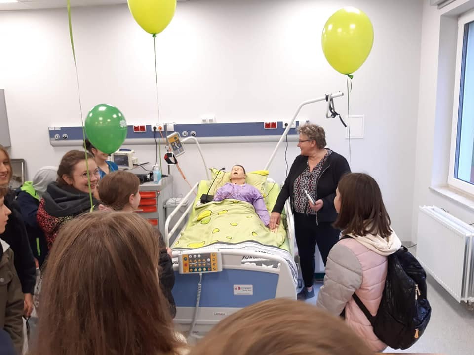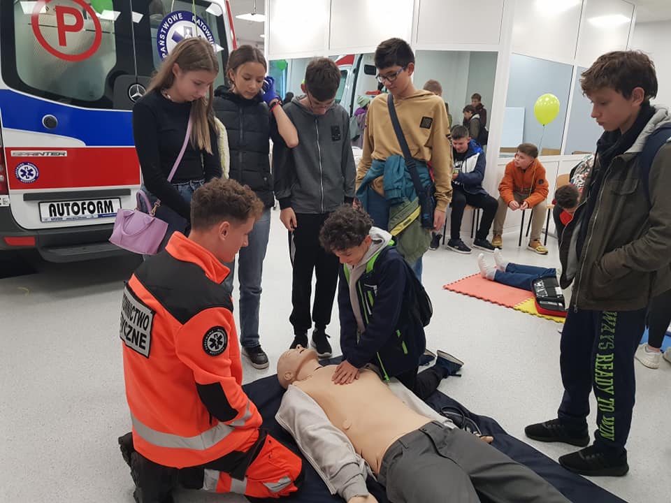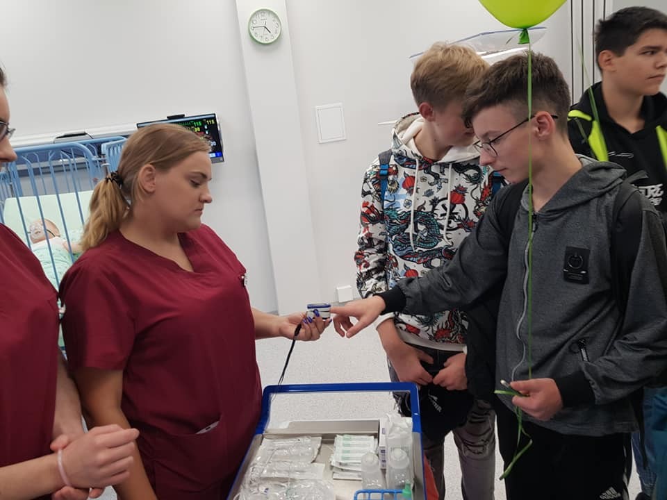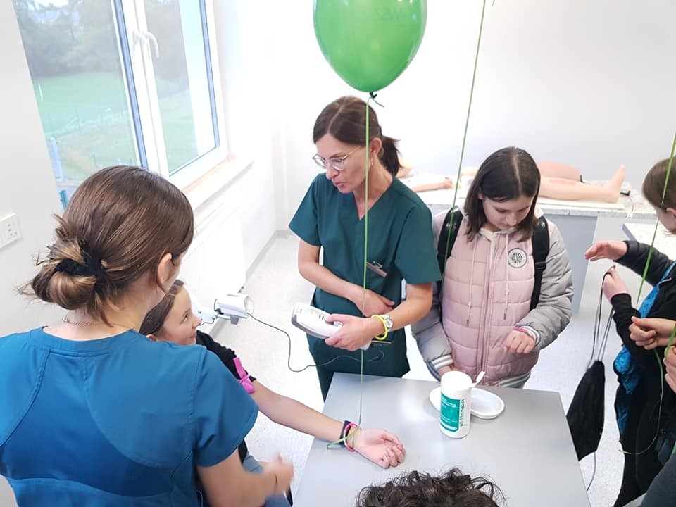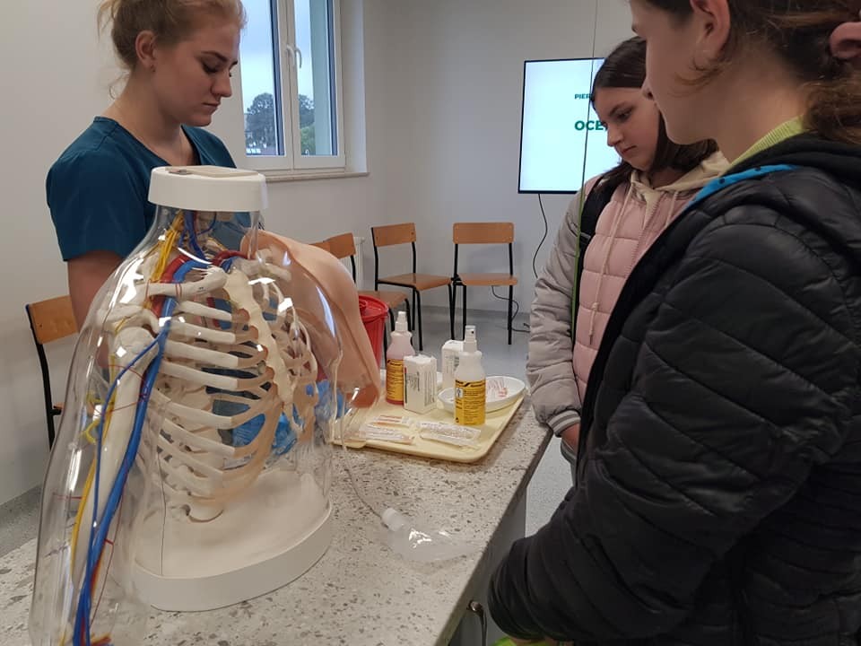 Po dwóch latach przerwy ponownie mogliśmy uczestniczyć w Małopolskiej Nocy Naukowców. Tym razem ósmoklasiści i siódmoklasiści wraz z opiekunami 30 września w godzinach popołudniowo-wieczornych udali się na teren Kampusu Dydaktyczno-Sportowego PWSZ w Nowym Sączu. Wycieczkę rozpoczęliśmy od wizyty w Centrum Symulacji Medycznych przy Instytucie Zdrowia. Uczniowie udali się do pracowni umiejętności pielęgniarskich i umiejętności ratowniczych. Tam mogli zobaczyć i doświadczyć, jak wykonuje się zabiegi pielęgniarsko-higieniczne u osoby dorosłej, jak należy pielęgnować noworodka, niemowlę i dziecko. Mogli zobaczyć, jak wykonuje się pomiary np. ciśnienia i sprawdzić własne. Pod okiem ratowników ćwiczyli udzielanie pierwszej pomocy i wykonywanie resuscytacji krążeniowo-oddechowej u dorosłego i dziecka. Uczniowie mogli również wejść do karetki, dowiedzieć się i zobaczyć, jak jest ona wyposażona. Duże wrażenie na uczestnikach wyjazdu zrobił stół anatomiczny 3D. Dotykając tego stołu można było dowolnie obracać modele i obserwować poszczególne organy i układy.