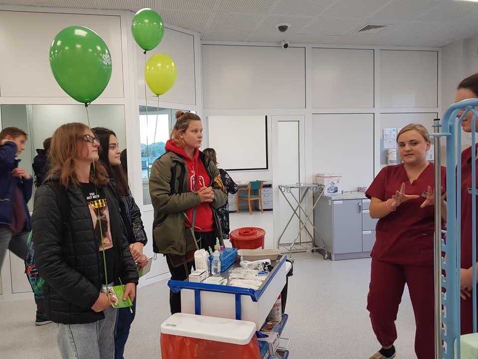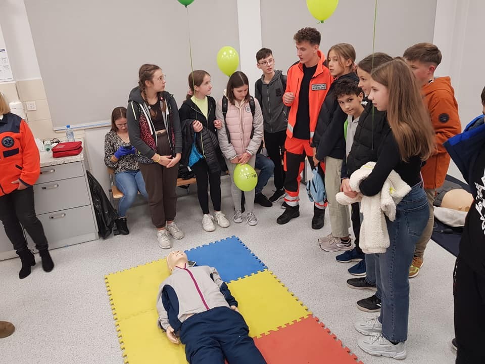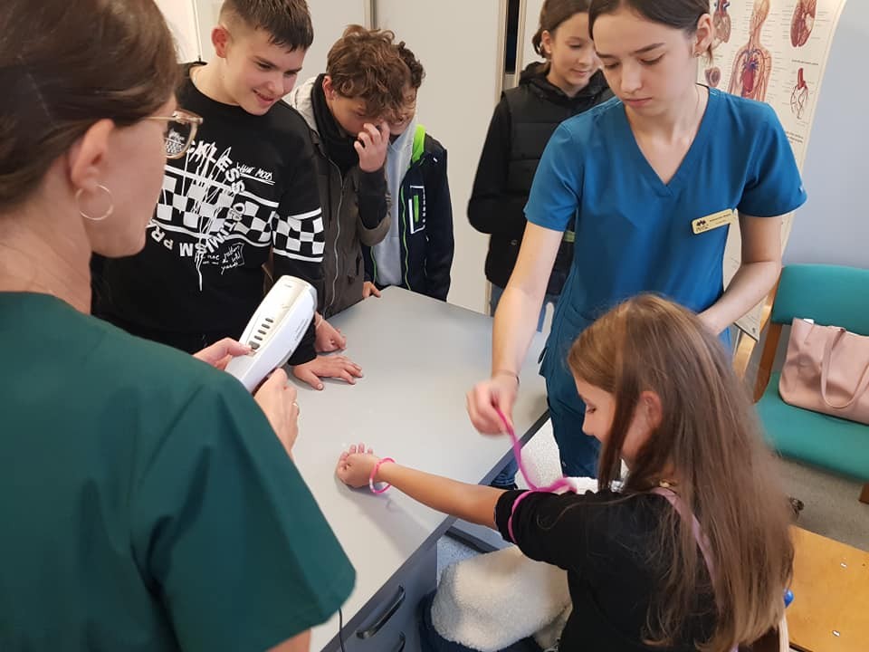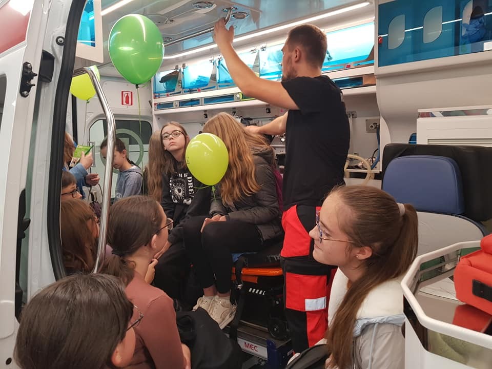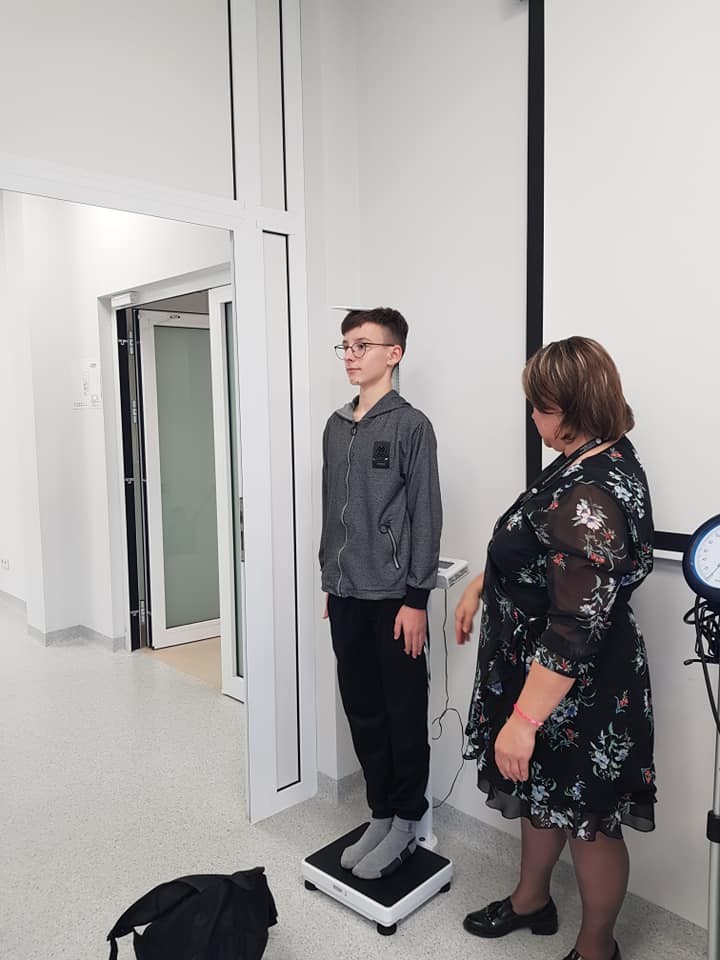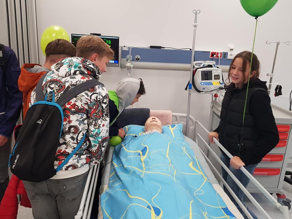 Po dwóch latach przerwy ponownie mogliśmy uczestniczyć w Małopolskiej Nocy Naukowców. Tym razem ósmoklasiści i siódmoklasiści wraz z opiekunami 30 września w godzinach popołudniowo-wieczornych udali się na teren Kampusu Dydaktyczno-Sportowego PWSZ w Nowym Sączu. Wycieczkę rozpoczęliśmy od wizyty w Centrum Symulacji Medycznych przy Instytucie Zdrowia. Uczniowie udali się do pracowni umiejętności pielęgniarskich i umiejętności ratowniczych. Tam mogli zobaczyć i doświadczyć, jak wykonuje się zabiegi pielęgniarsko-higieniczne u osoby dorosłej, jak należy pielęgnować noworodka, niemowlę i dziecko. Mogli zobaczyć, jak wykonuje się pomiary np. ciśnienia i sprawdzić własne. Pod okiem ratowników ćwiczyli udzielanie pierwszej pomocy i wykonywanie resuscytacji krążeniowo-oddechowej u dorosłego i dziecka. Uczniowie mogli również wejść do karetki, dowiedzieć się i zobaczyć, jak jest ona wyposażona. Duże wrażenie na uczestnikach wyjazdu zrobił stół anatomiczny 3D. Dotykając tego stołu można było dowolnie obracać modele i obserwować poszczególne organy i układy.