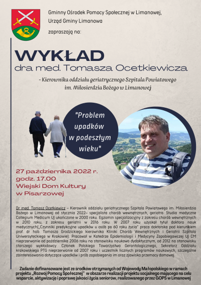 Urząd Gminy Limanowa i Gminny Ośrodek Pomocy Społecznej w Limanowej zapraszają na wykład dr med. Tomasza Ocetkiewicza - Kierownika oddziału geriatrycznego Szpitala Powiatowego im. Miłosierdzia Bożego w Limanowej.