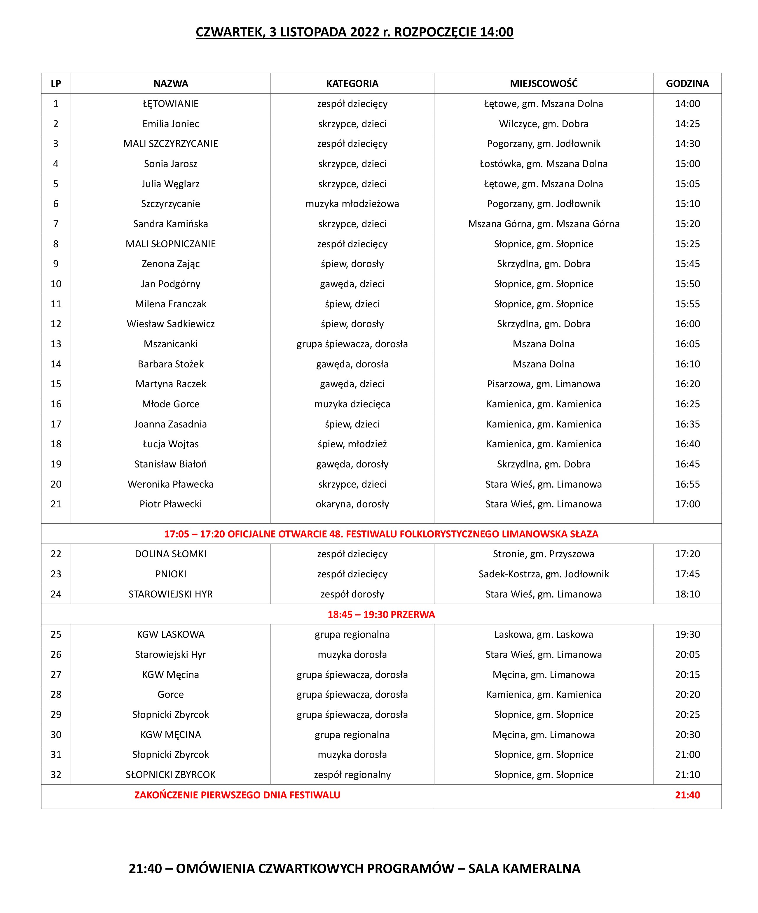 17:05 – 17:20 – oficjalne otwarcie 48. Festiwalu Folklorystycznego ,,Limanowska Słaza”