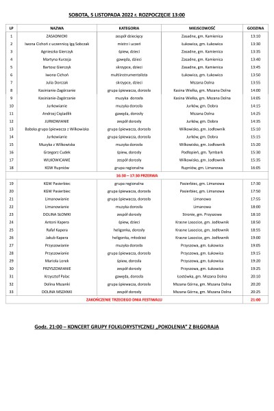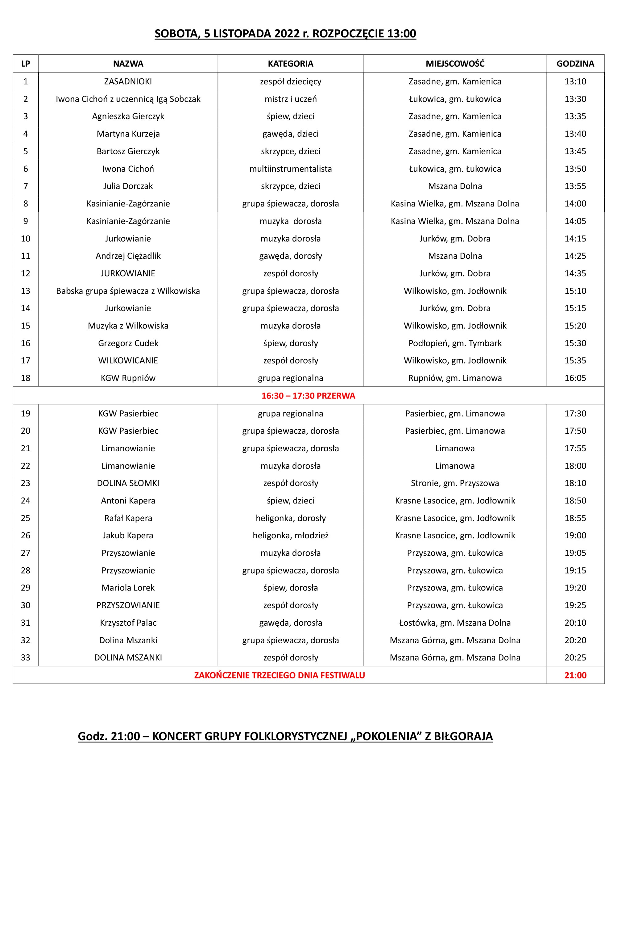 21:00 – koncert Grupy Folklorystycznej ,,Pokolenie” na zakończenie wszystkich przesłuchań konkursowych