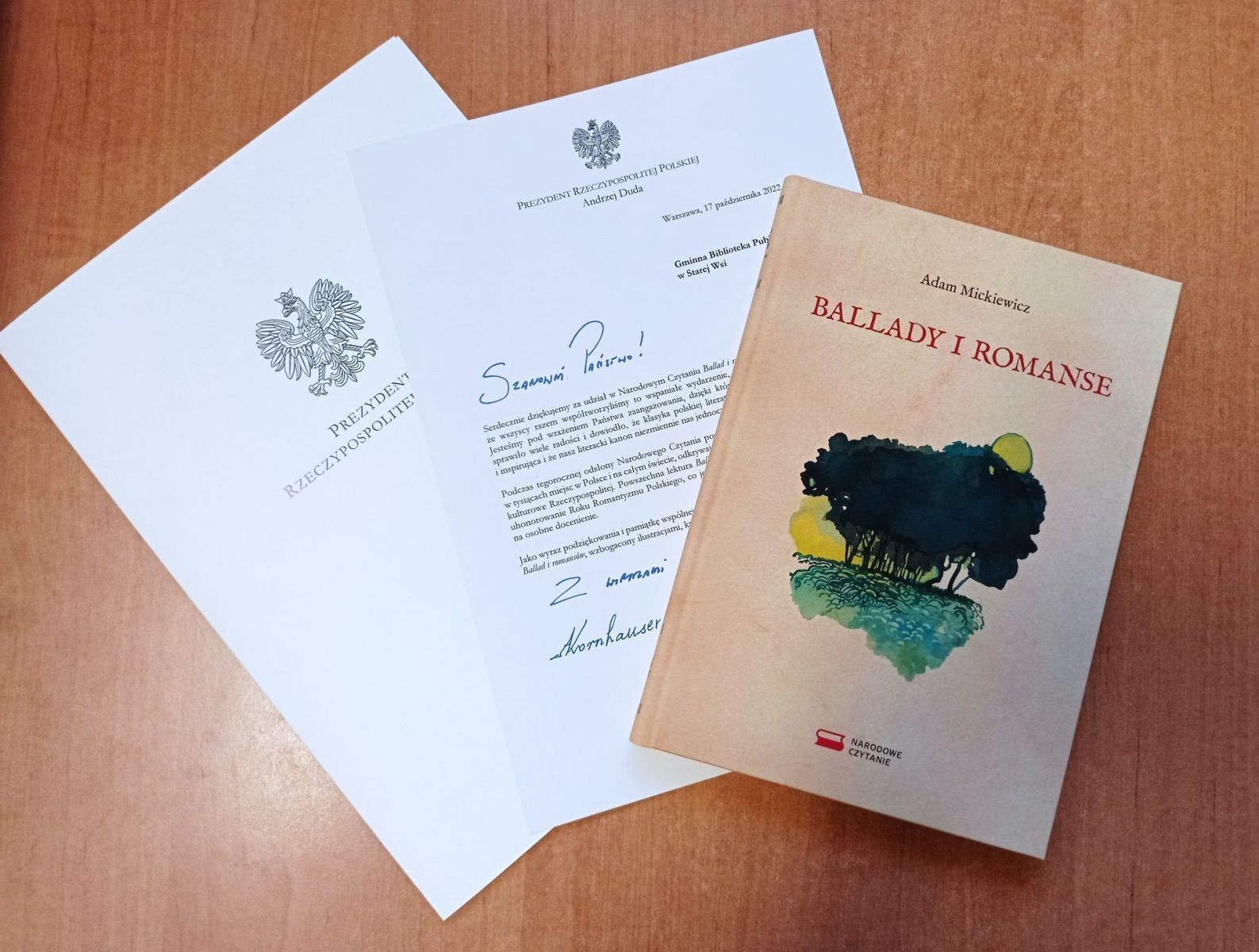 Jako wyraz podziękowania i pamiątkę wspólnej lektury proszę przyjąć okolicznościowy egzemplarz "Ballad i Romansów” wzbogacony ilustracjami, które powstały specjalnie na Narodowe Czytanie 2022 – pisze prezydent Andrzej Duda.