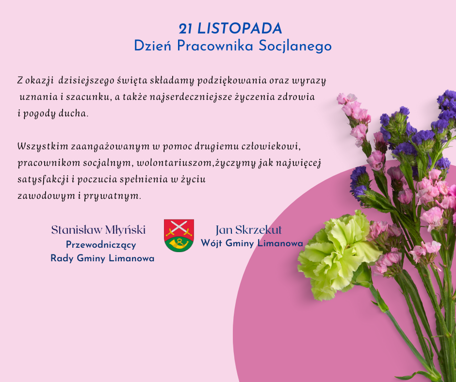 Życzenia od władz Gminy Limanowa z okazji 21 listopada – Dnia Pracownika Socjalnego.